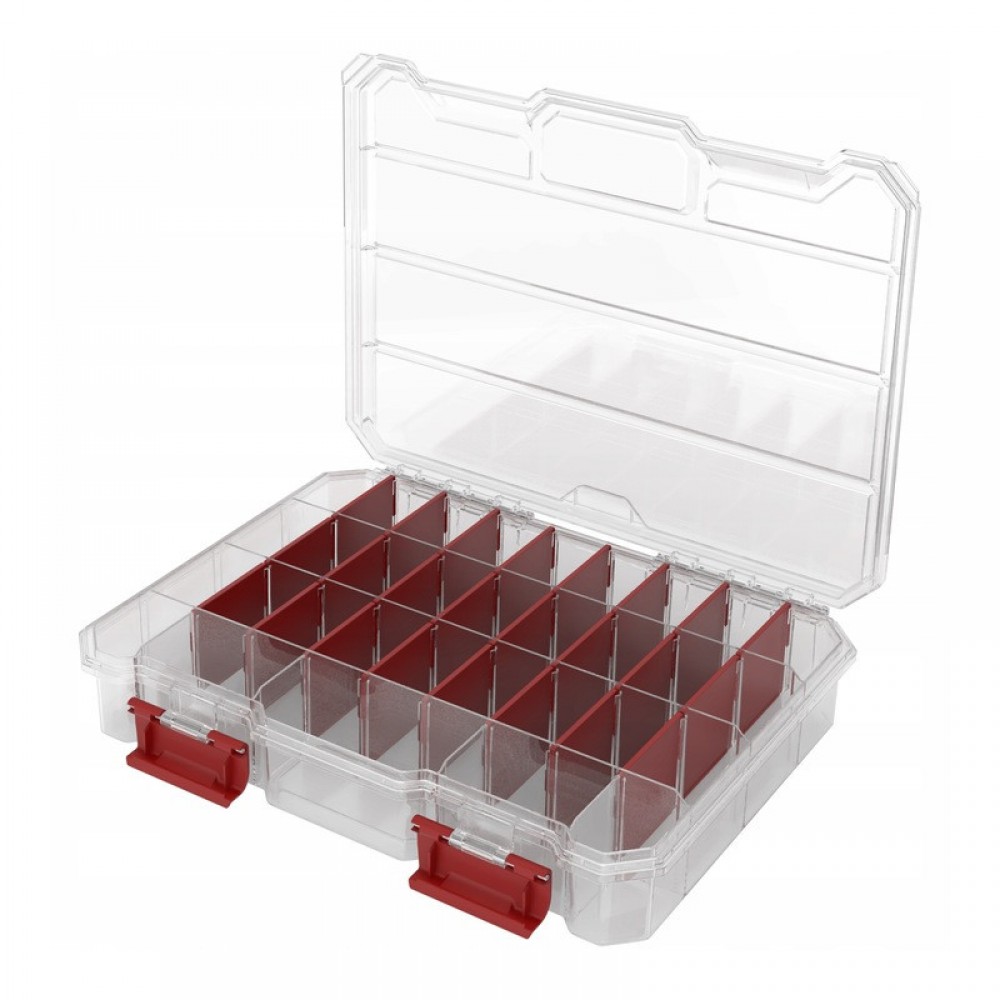 Органайзер оснащений 24 регульованими роздільниками, які можна вільно налаштовувати. Це дозволяє користувачеві створювати до 32 незалежних відділень. Така гнучкість забезпечує ідеальне розміщення різноманітних аксесуарів – від дрібних гвинтів до складніших робочих предметів.