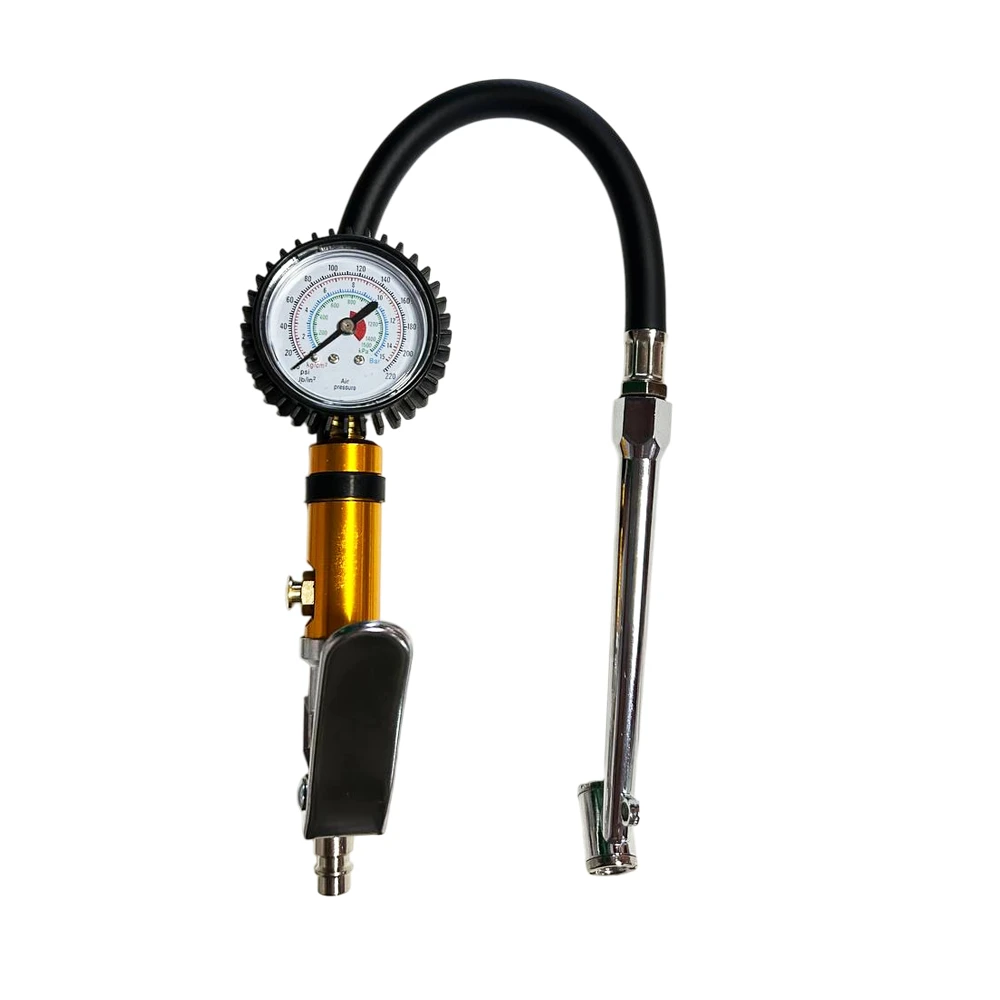 - Аналоговий манометр з подвійною шкалою (бар/psi), захищений гумовим чохлом.