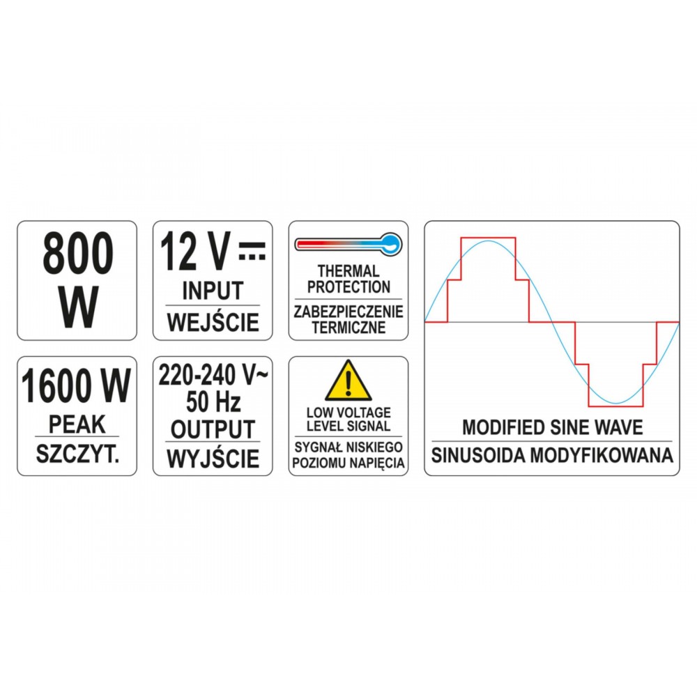 Перетворювач напруги з джерела 12 В DC в 230 В AC YATO 800 Вт