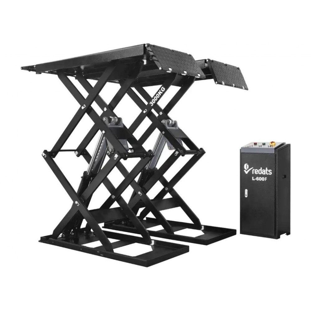 Підйомник ножичний REDATS L-600F з вантажопідйомністю 3 тонни і простим управлінням забезпечує зручне обслуговування легкових автомобілів і легкої комерційної техніки, що робить його вигідним придбанням для автосервісів. Висота платформи в опущеному стані становить 105 мм, що дозволяє ефективно працювати з низькими автомобілями. Максимальна висота підйому - 1850 мм. Оснащений двигуном потужністю 2,2 кВт з живленням від мережі 230 В.