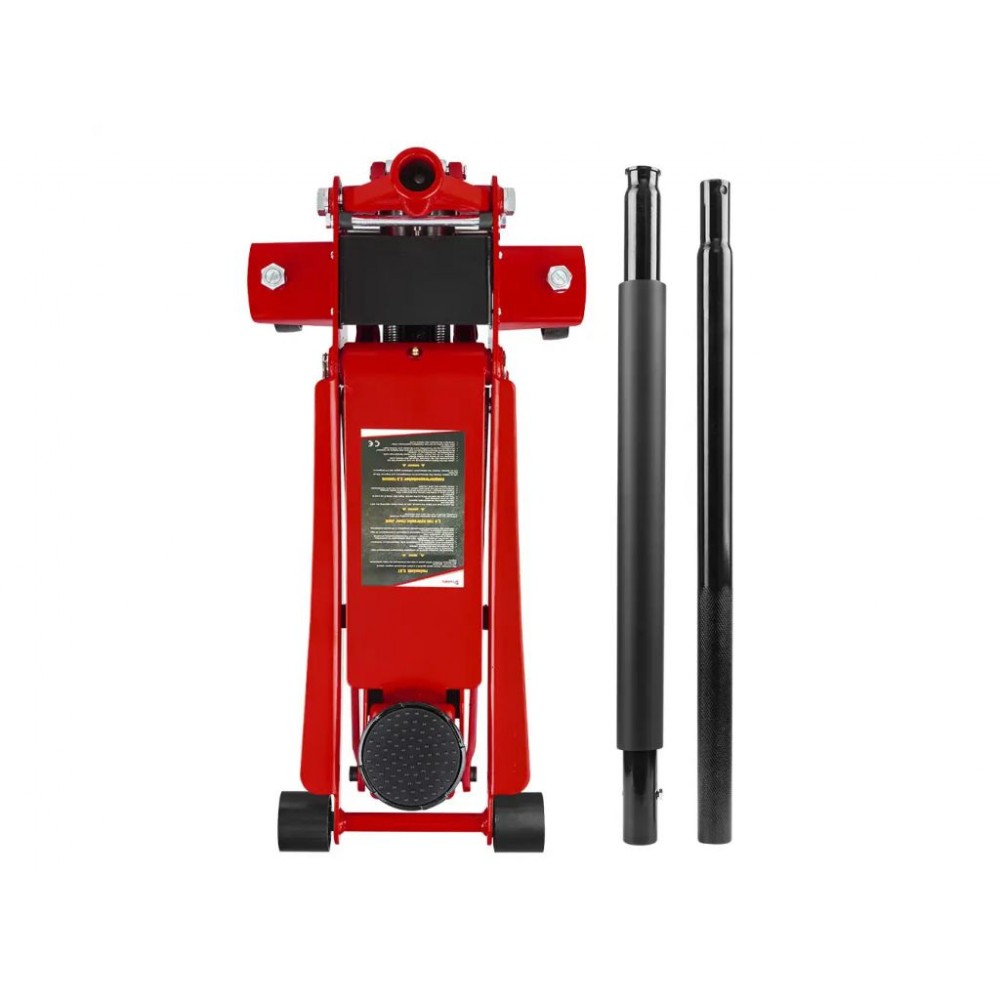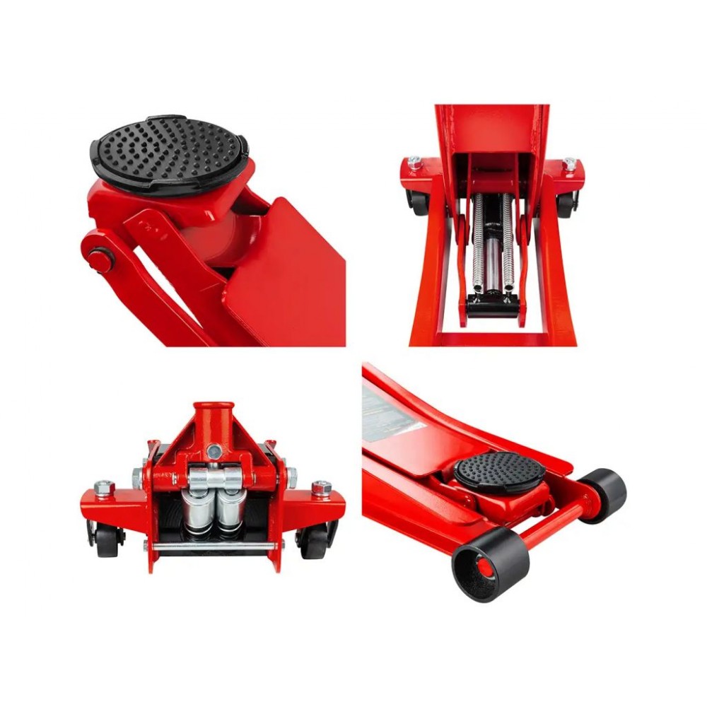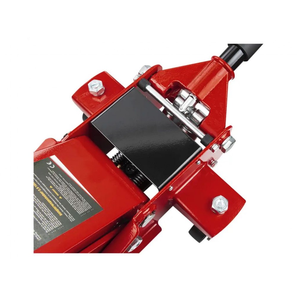 Завдяки подвійному насосу підйом і опускання виконуються надзвичайно швидко. Вбудований запобіжний клапан захищає домкрат від перенавантаження. Поворотне на 360° сідло, поворотні металеві ролики та зручна ручка довжиною 100 см дозволяють легко позиціонувати підйомник під автомобілем. Конструкція виконана з міцної сталі і має високу надійність і зносостійкість. Завдяки своїй універсальності, цей низькопрофільний домкрат стане вигідним придбанням для роботи з автомобілями.