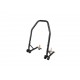 Конструкція виготовлена з міцних сталевих труб діаметром 32 мм, що гарантує її стійкість та стабільність піднятого мотоцикла. Підставка покрита захисною фарбою чорного кольору, завдяки чому зберігає привабливий зовнішній вигляд навіть у складних умовах експлуатації. Подвійні роликові колеса зі зносостійкого пластику мають діаметр 75,5 мм, що дозволяє легко переміщати стійку навіть по нерівних поверхнях. Для захисту рук від травмування ця підставка під мотоцикл оснащена спеціальними ручками.