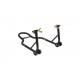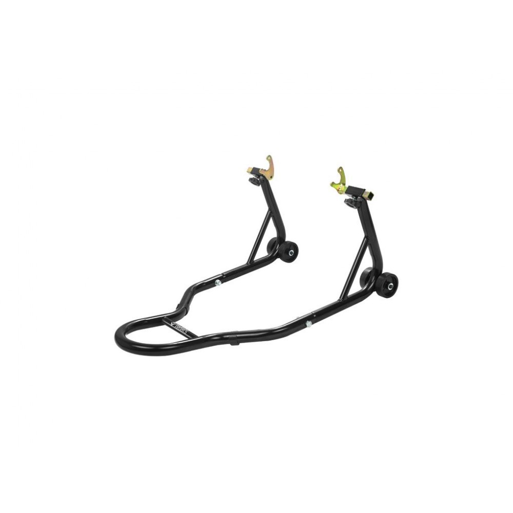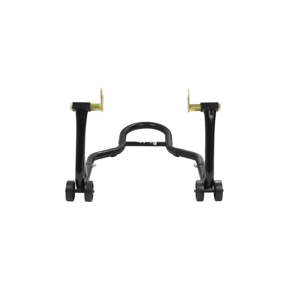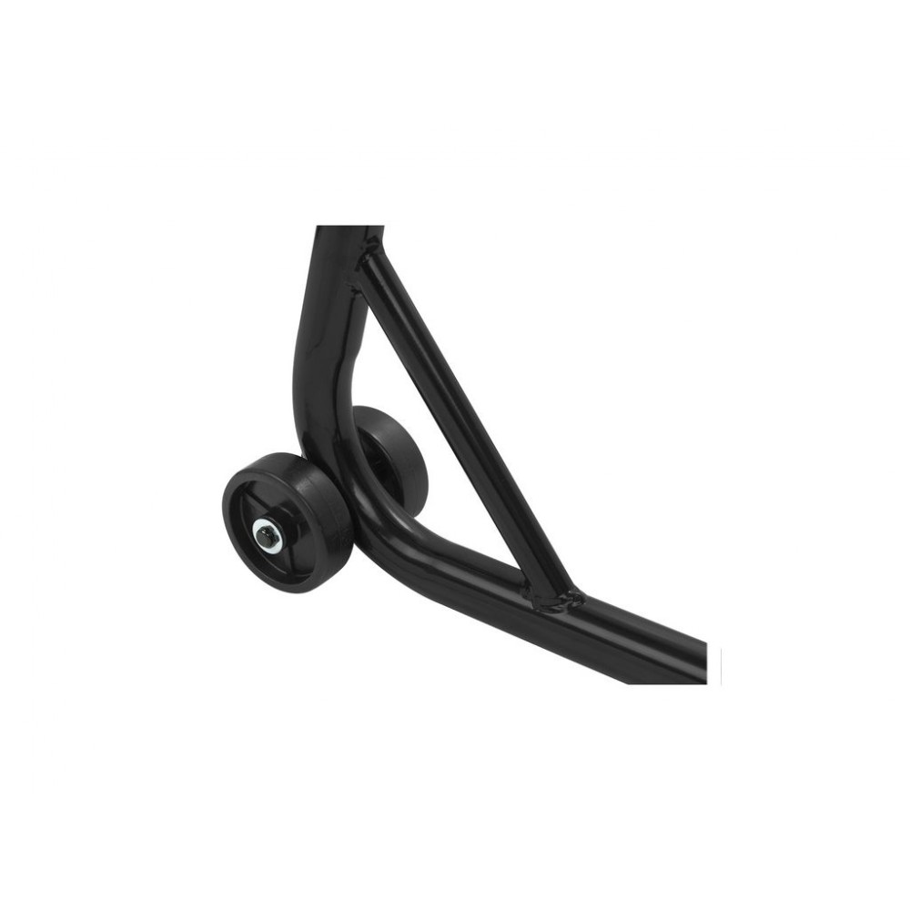 Матеріал виготовлення підставки - міцні сталеві труби діаметром 32 мм, що забезпечує її стійкість і стабільність піднятого мотоцикла. Покриття захисною чорною фарбою попереджає виникнення корозії і дозволяє надовго зберегти привабливий вигляд обладнання навіть у складних умовах експлуатації. Для уникнення травм рук підставка оснащена спеціальними ручками. Завдяки подвійним роликовим колесам діаметром 75,5 мм стійку можна легко переміщати по робочій зоні. Проста в експлуатації, надійна та компактна, ця задня стійка під мотоцикл відмінно підходить як для власного гаража, так і для автомайстерень.