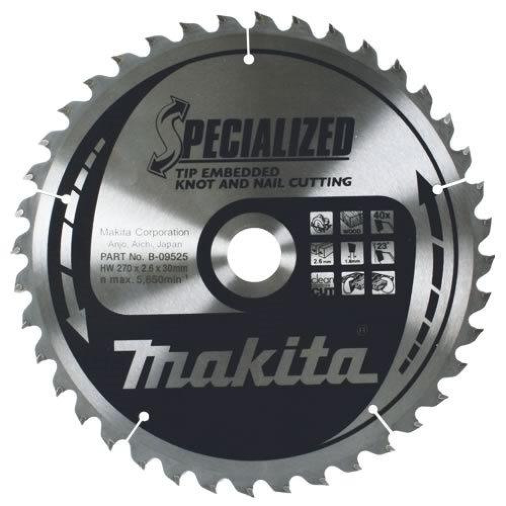 Головною особливістю диска Makita SPECIALIZED є його призначення для роботи з деревиною, що містить металеві включення, такі як цвяхи. Це досягається завдяки спеціально розробленим зубцям, які витримують ударні навантаження без пошкодження, забезпечуючи при цьому чистий та рівний зріз. Це робить його незамінним для демонтажних робіт, будівництва та обробки вторинної деревини.