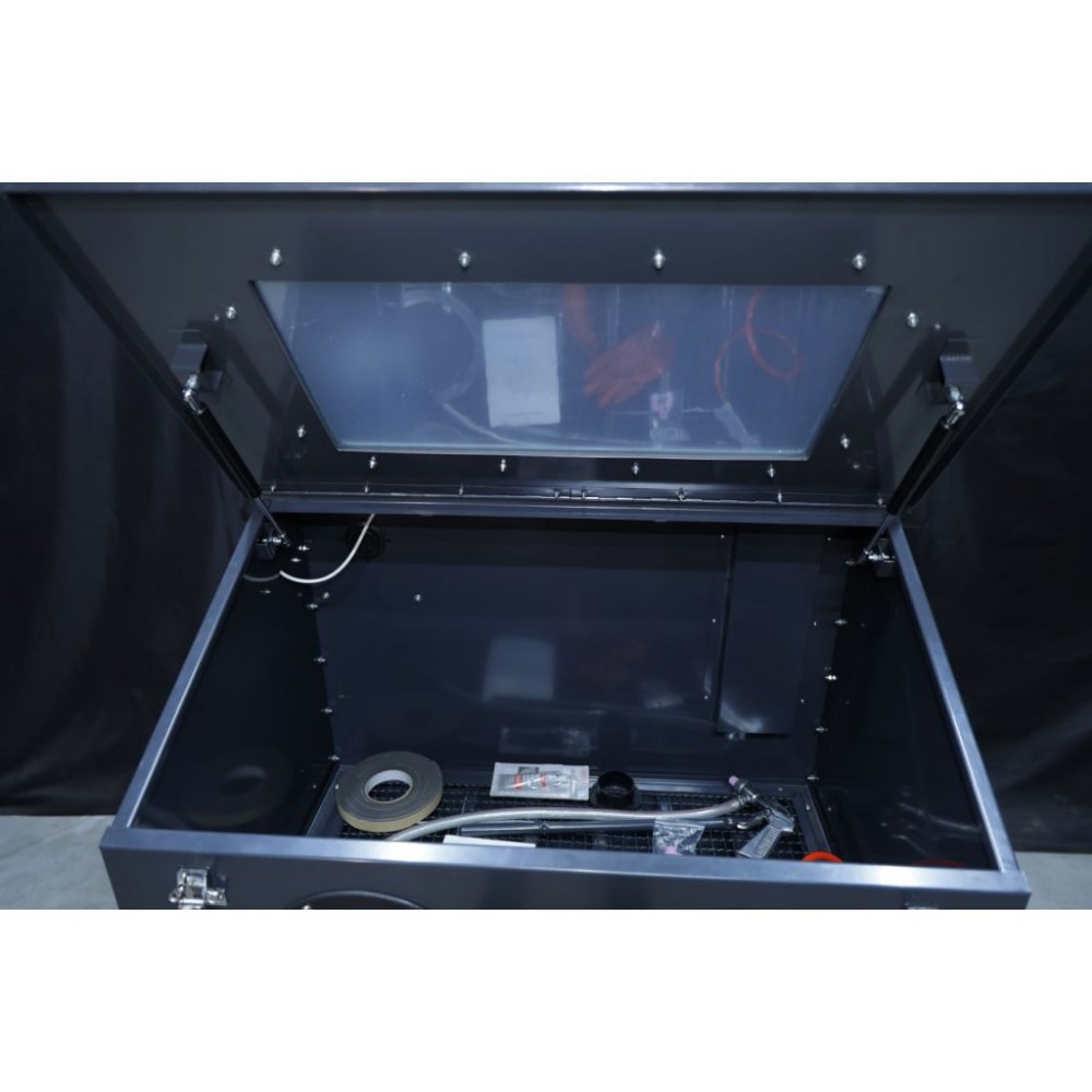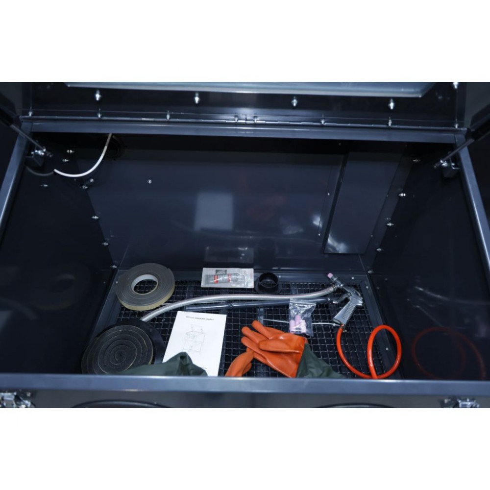 Особливістю моделі є витяжна система DC15 з фільтром циклонного типу, яка ефективно очищає повітря в камері від пилу та легкого абразиву, покращуючи видимість, підвищуючи комфорт роботи та ефективність. Верхні дверцята, що утримуються за допомогою газових упорів, значно спрощують завантаження і вивантаження деталей. Також верхнє розміщення дверей дозволяє встановити камеру більш компактно, без додаткових щілин по боках. Піскоструминний пістолет має 4 керамічні змінні форсунки з різною формою, завдяки чому можна коригувати напрямок та інтенсивність абразивного потоку. Зручний дренажний отвір забезпечує швидку і легку заміну абразиву. Оглядове вікно без сліпих зон розміром 58х27 см дає змогу максимально контролювати процес обробки. Камера поставляється запакованою та має все необхідне для початку роботи, крім компресора та абразивного матеріалу. Якщо вас цікавлять піскоструминні камери ціна яких доступна, а якість гарантована, обладнання MAST буде відмінним вибором.