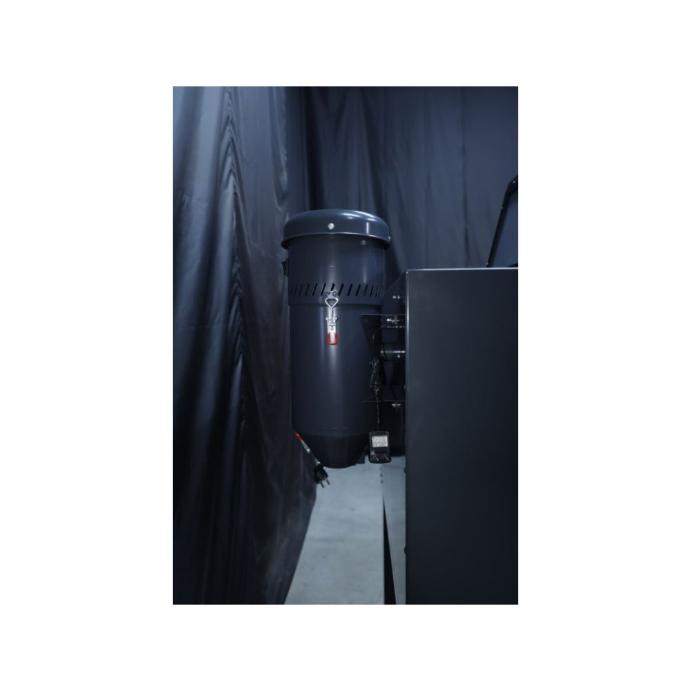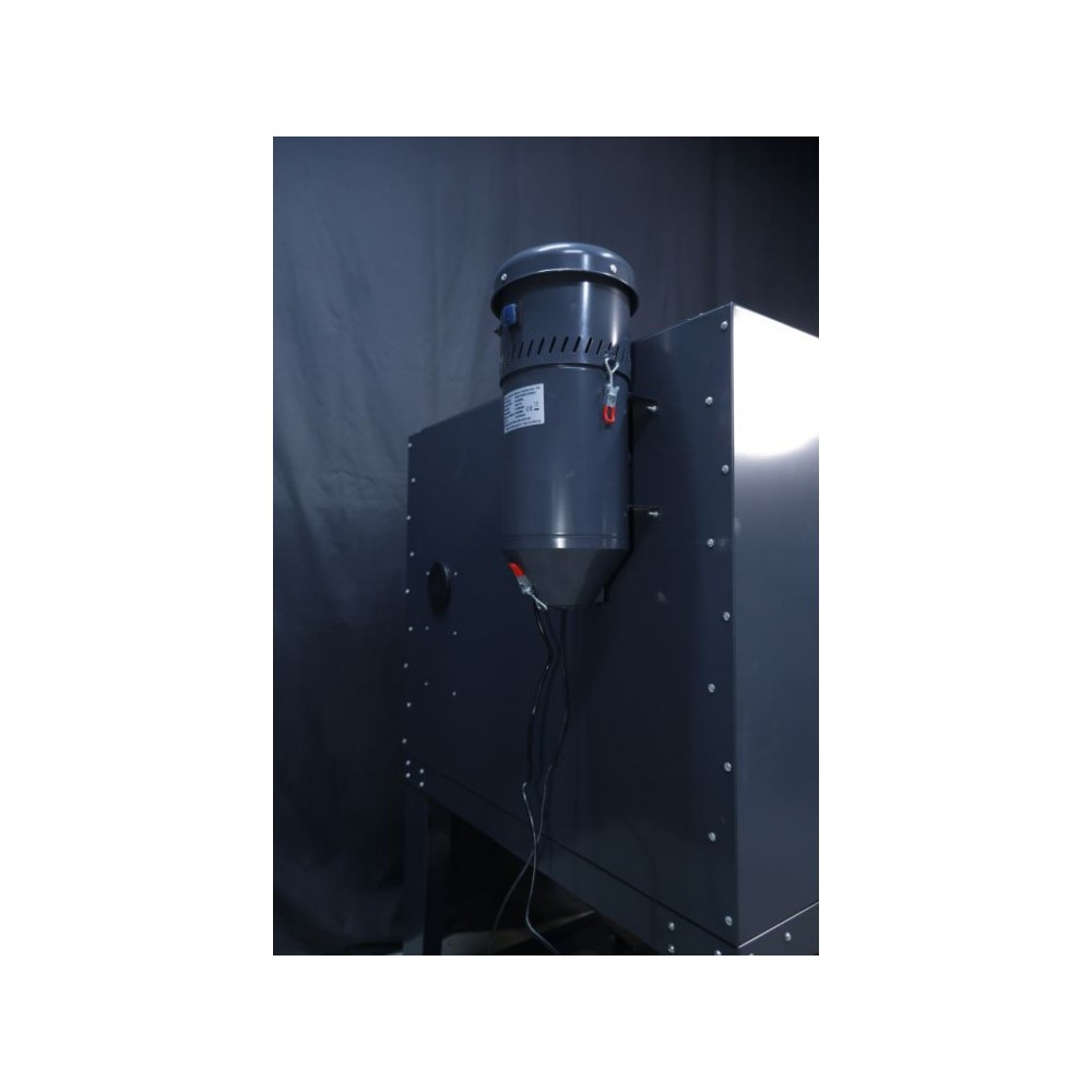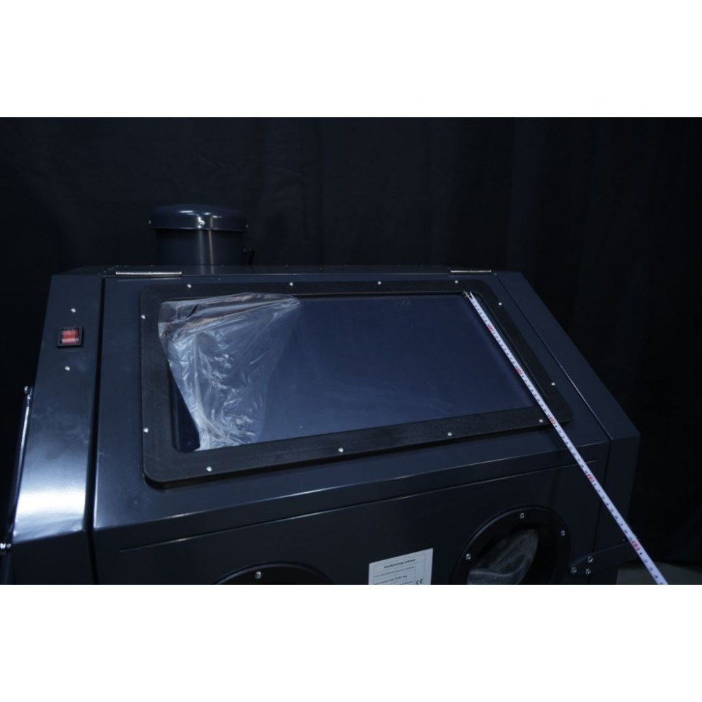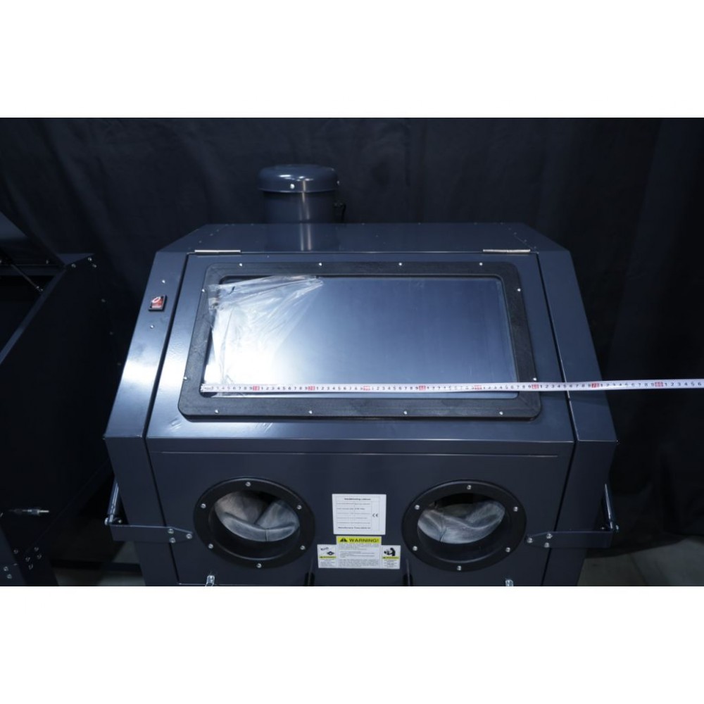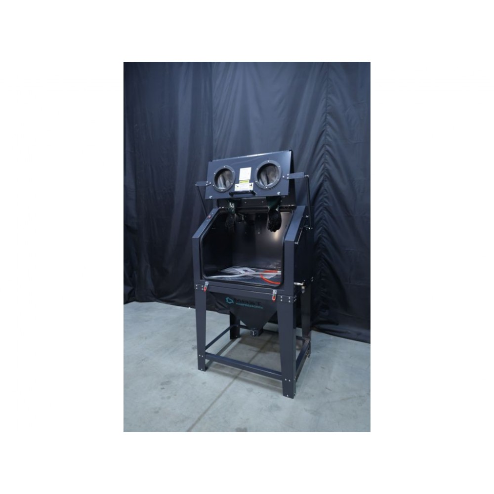 Камера оснащена витяжною системою DC15 з фільтром циклонного типу, яка ефективно видаляє пил і легкий абразив всередині камери, що покращує видимість робочої зони і зручність роботи. Для полегшення завантаження і вивантаження дверцята обладнані газовими упорами. Піскоструминний пістолет має 4 змінні керамічні насадки з різними соплами, завдяки чому можна регулювати силу і напрямок абразивного потоку. Така камера піскоструйна має компактний розмір, що дозволяє зручно використовувати її у невеликому приміщенні.