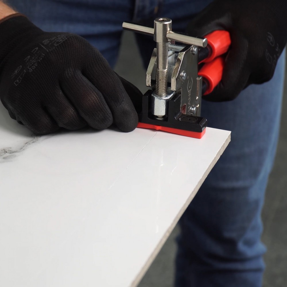 Алюмінієва шина кріпиться до плитки вбудованими присосками. По алюмінієвій направляючій переміщується каретка з трьох позиційним твердосплавним роликом, який прорізає глазуровану поверхню в заданому напрямку. Додаткова рукоятка дозволяє оброблювати плитку товщиною до 15мм, рівномірно навантажувати ріжучий елемент, що гарантує якісний розлом.