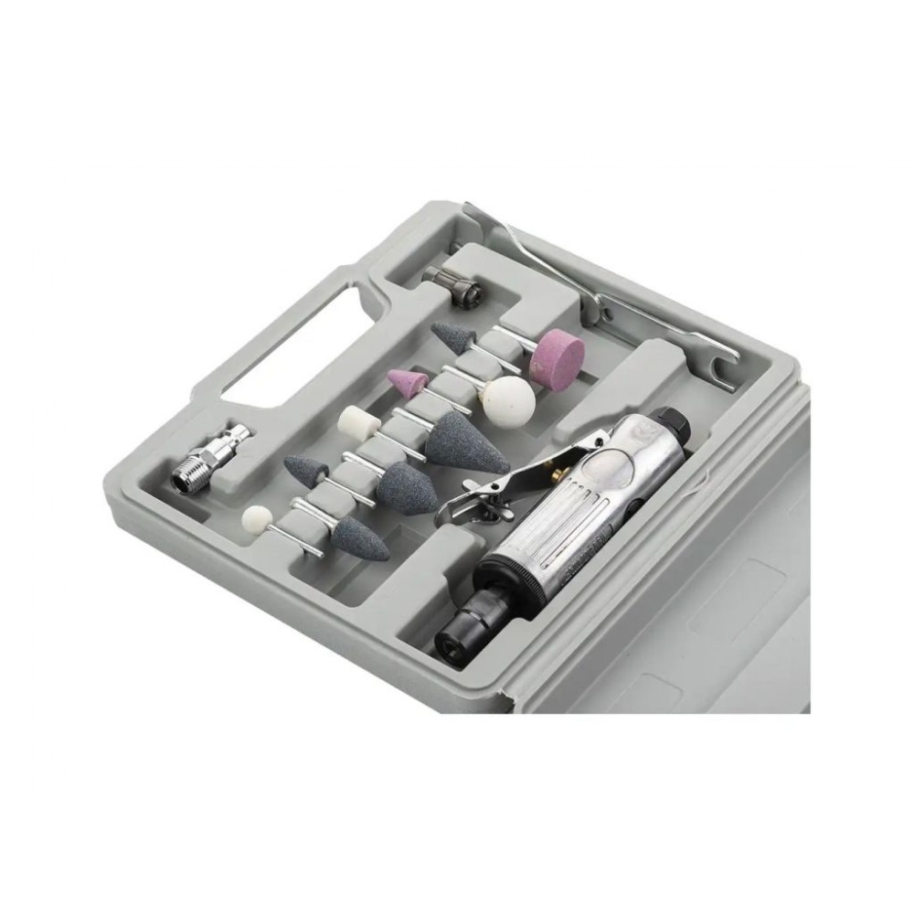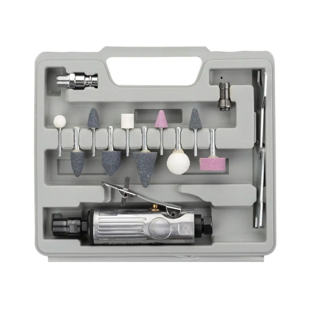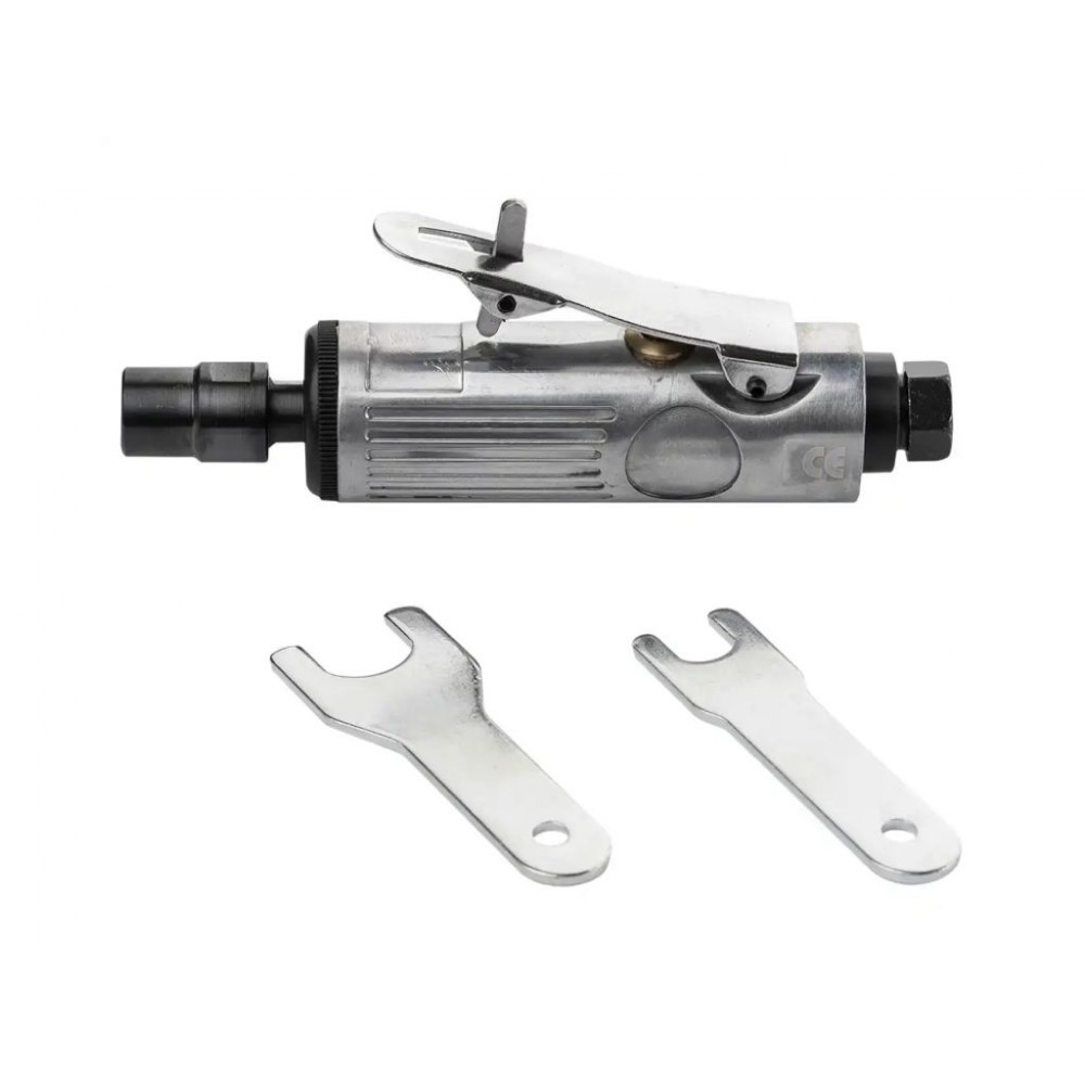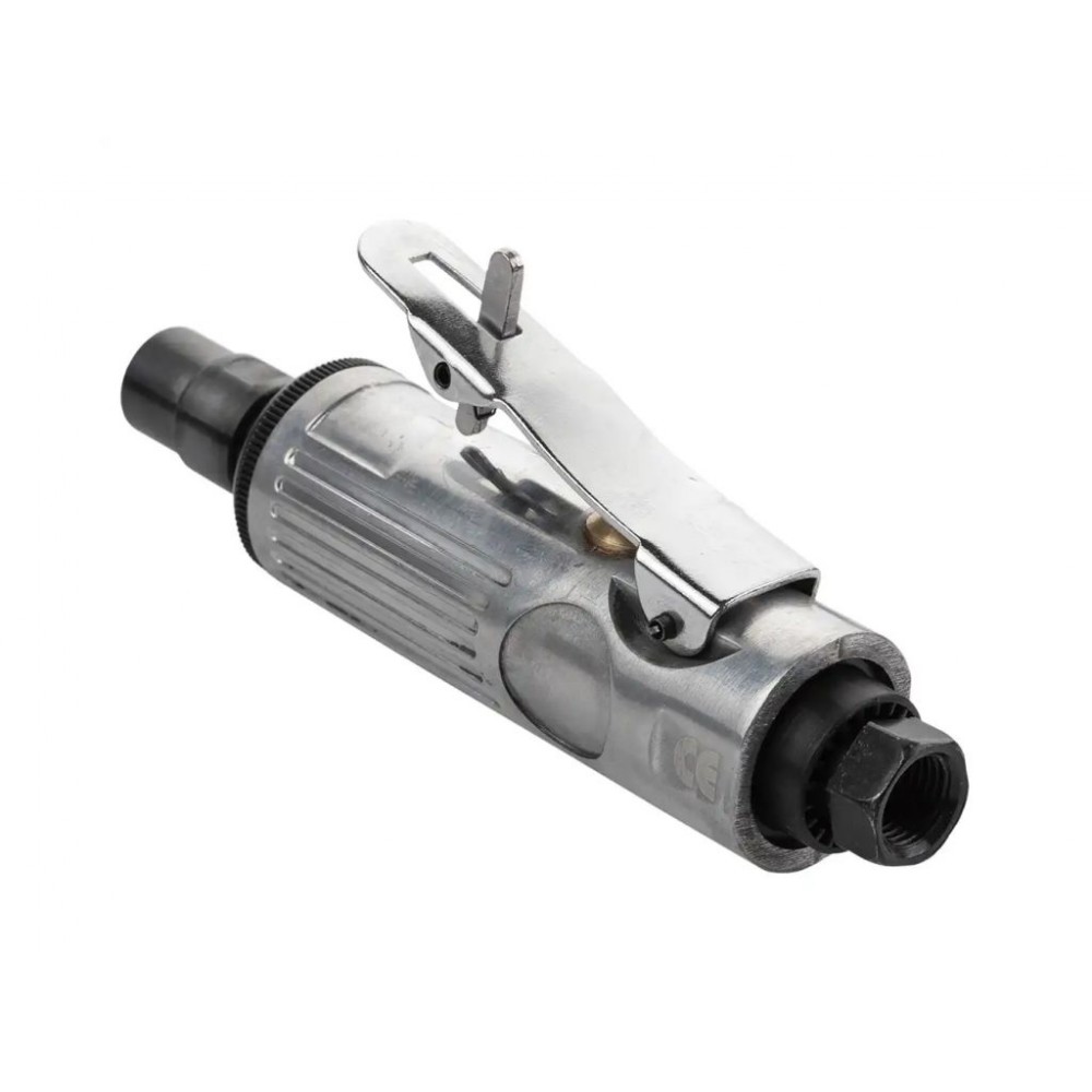 Діаметр вхідного отвору - ¼”, мінімальний діаметр шланга - 10 мм. 2 швидкозмінні наконечники, 3 мм і 6 мм, дозволяють використовувати машину з широким спектром різних інструментів. Завдяки компактній конструкції з довжиною корпуса 152 мм і невеликій вазі ця пневмошліфмашинка для автосервісу зручна в експлуатації і не втомлює руки.