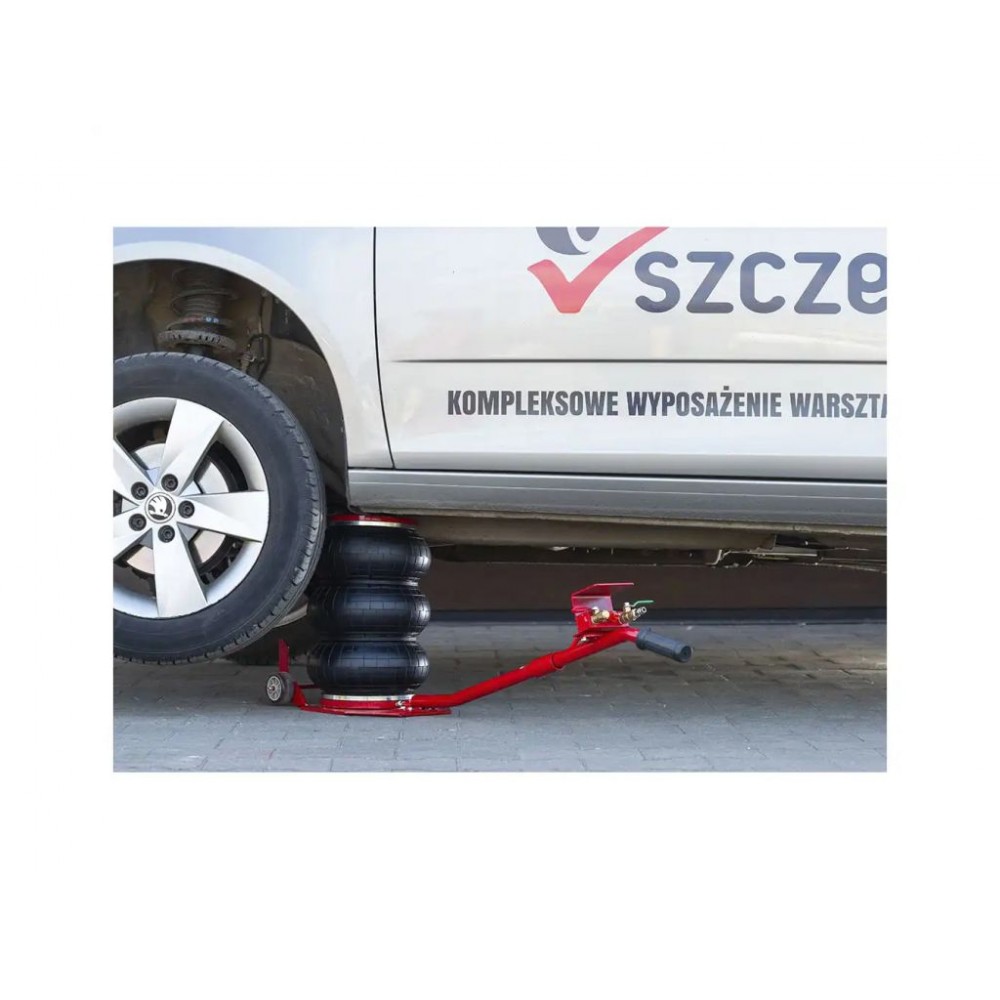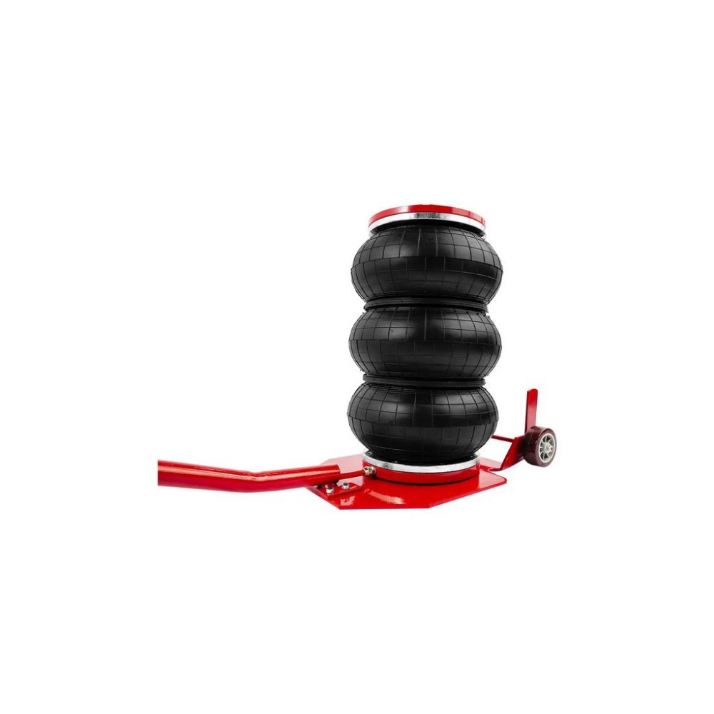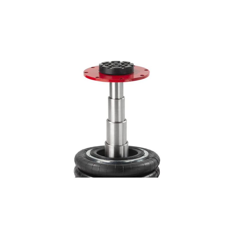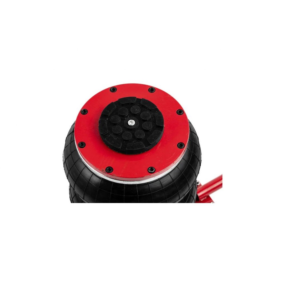 Сильфон має діаметр 270 мм і виготовлений з багатошарової армованої гуми, що забезпечує його герметичність і стійкість до зношування. В комплект поставки входить гумова накладка, яка запобігає ковзанню автомобіля при підйомі. Завдяки довгій ручці і великим колесам цей пневмоподушковий домкрат можна легко і точно позиціонувати під авто.