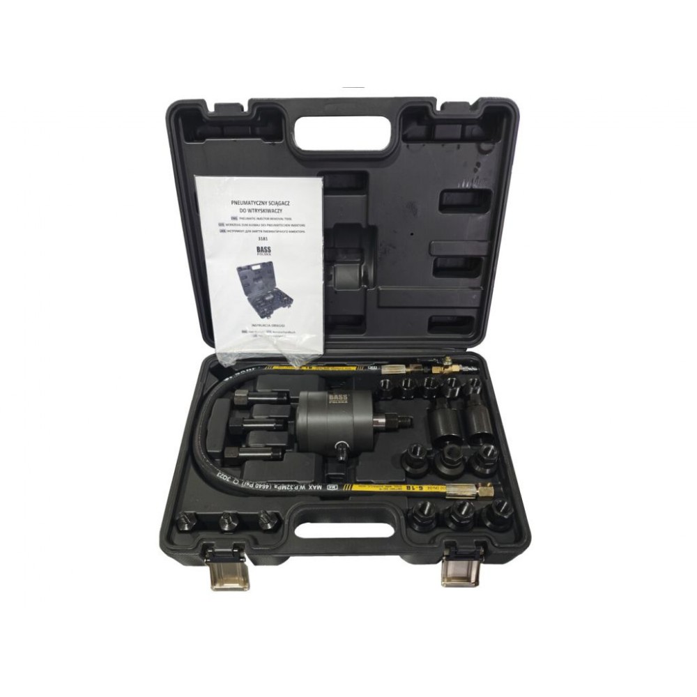 Пневматичний знімач форсунок з адаптерами Bass Polska BP-3181 є незамінним інструментом для автомайстерень, що спеціалізуються на ремонті дизельних двигунів. Він призначений для демонтажу застряглих або сильно закисних паливних форсунок з головки двигуна, забезпечуючи швидкий, ефективний і безпечний процес без ризику пошкодження інжектора чи головки.