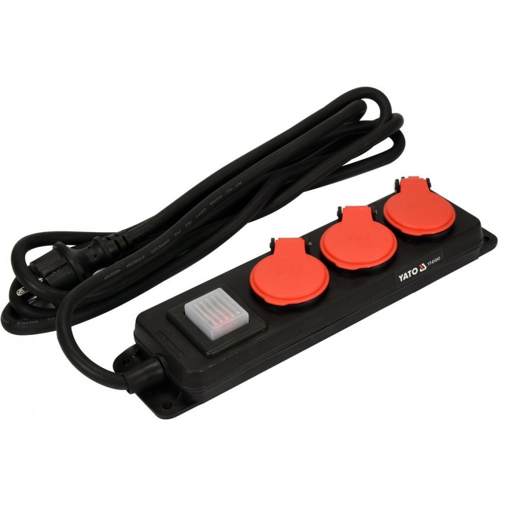 Подовжувач ел.-мережевий YATO: l= 3 м, колодка з 3 гніздами і вмик, 3-жильний Ø=1,5 мм², з заземл
