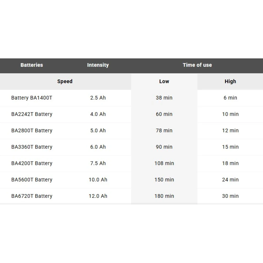 - до 78 хв - час роботи від акумулятора ємністю 5 А*год на мінімальній швидкості