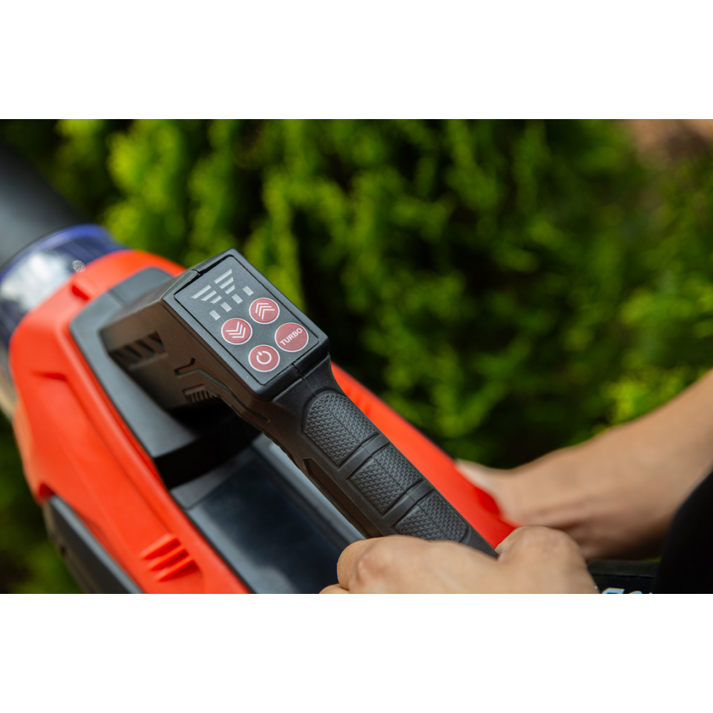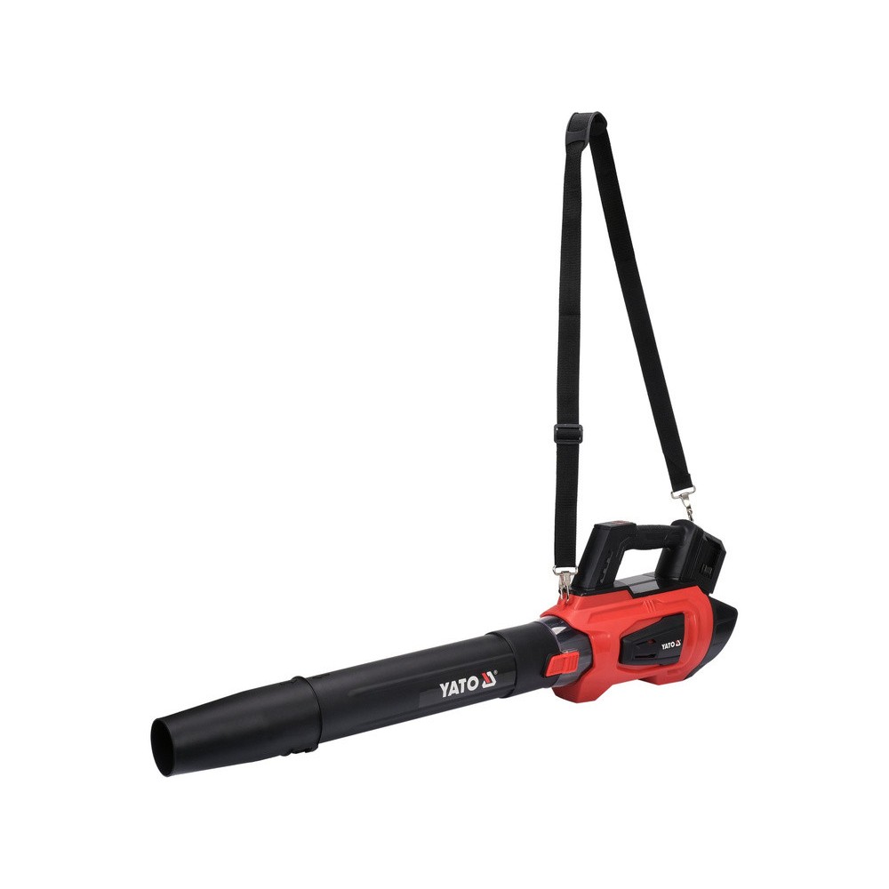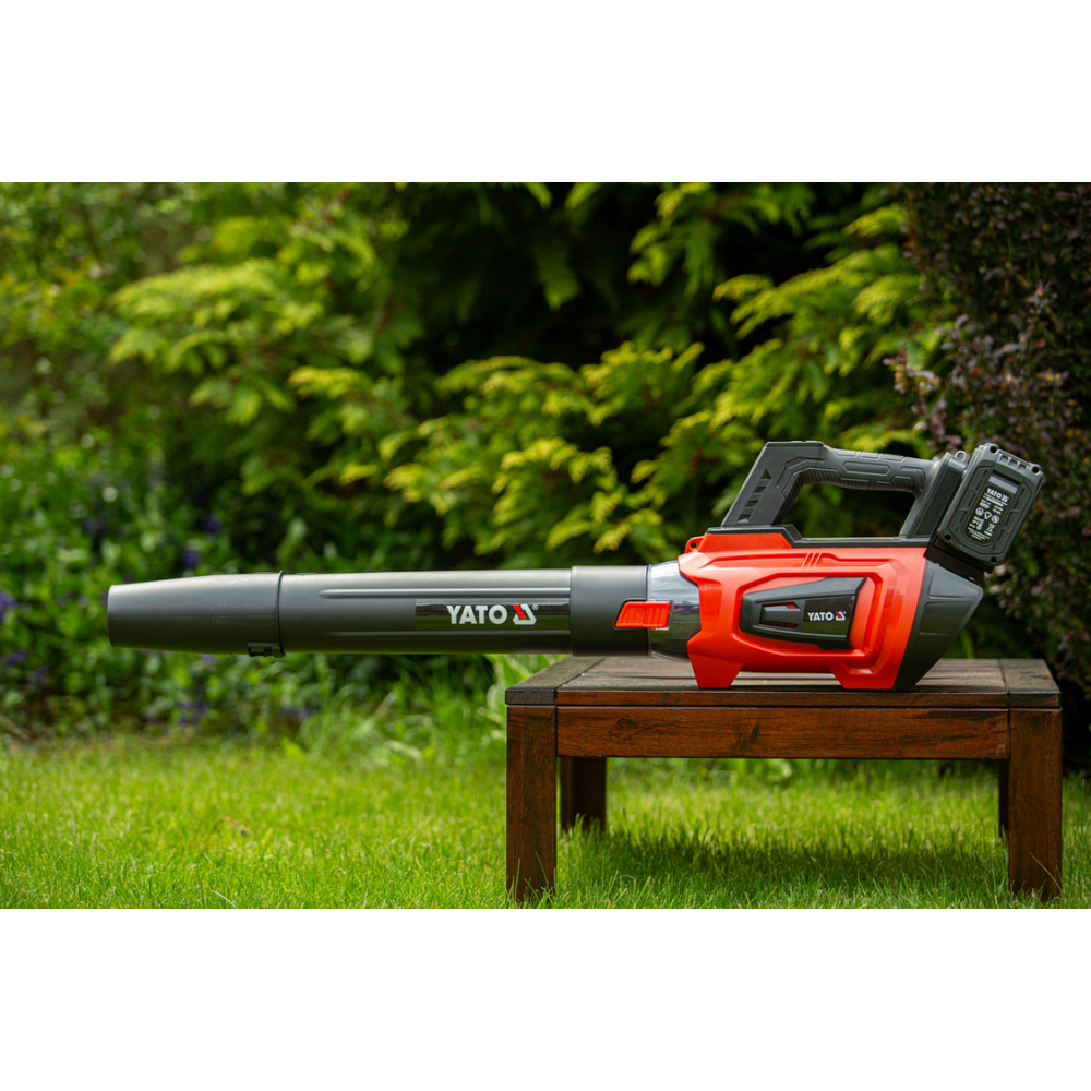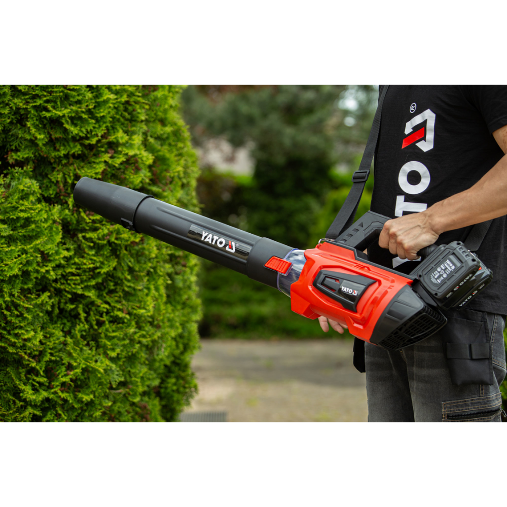 Повітродувка працює від безщіткового двигуна та двох акумуляторів YATO 18 В. Користувач може обрати 4 швидкості роботи та імпульсну швидкість Turbo. Незамінна в садівництві - під час видалення листя з газонів та перед будинками. Також може використовуватися для будівельних робіт - сушіння основи , наприклад, перед фарбуванням смуг, сушіння країв руберойду перед зварюванням. Легке складання забезпечує зручне зберігання. Акумуляторна повітродувка працює тихіше, ніж повітродувка з внутрішнім згорянням, набагато простіша у використанні та легша . Ремінець дозволяє носити повітродувку на плечі.