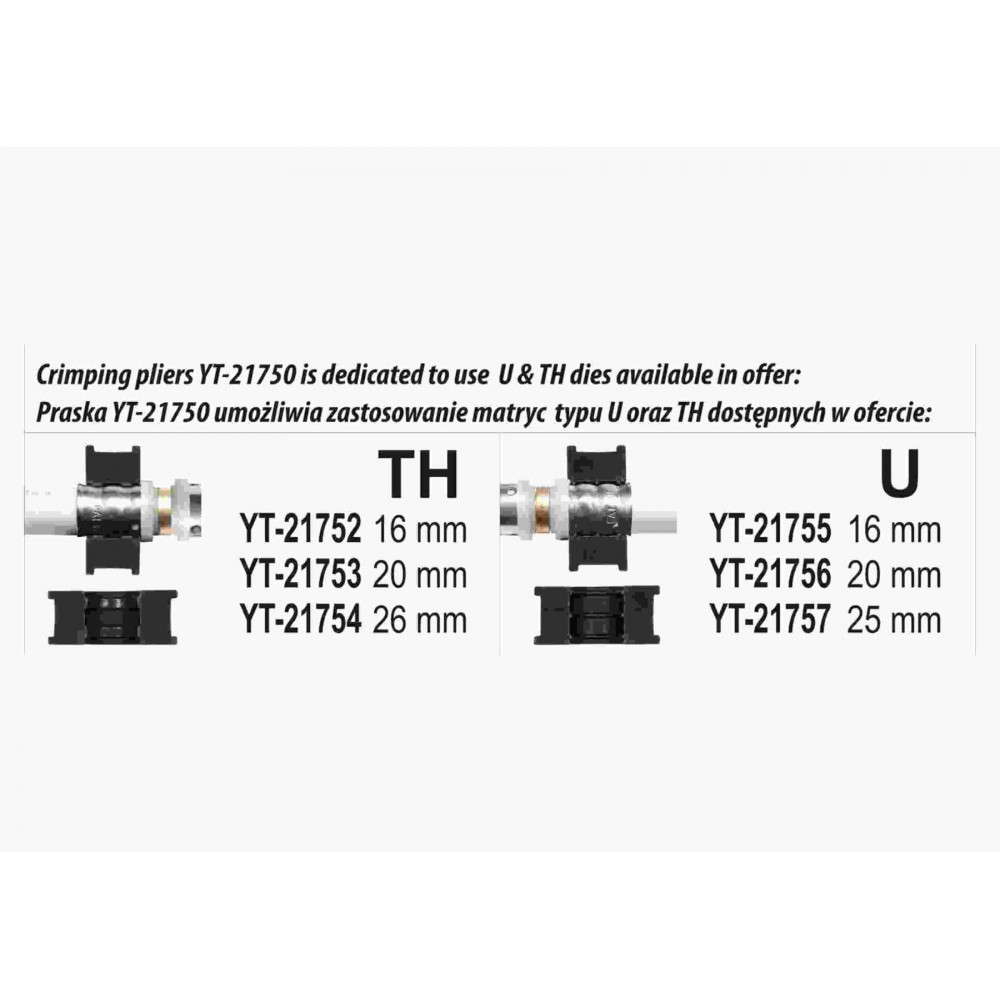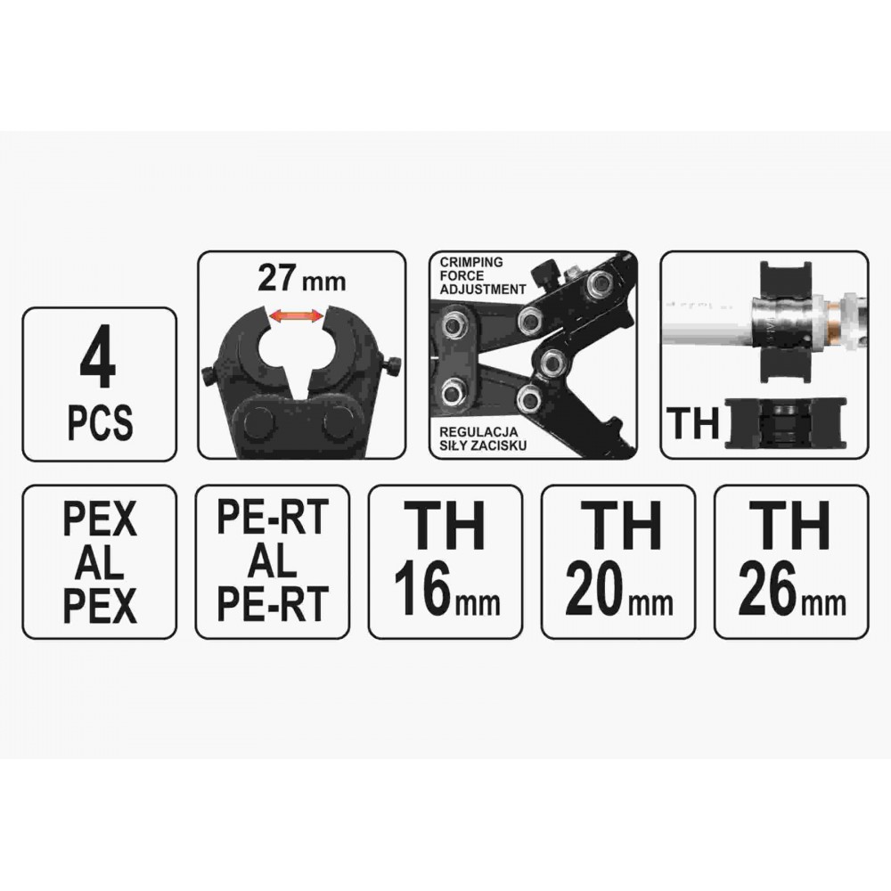 Прес-кліщі для металопластикових труб YATO YT-21750 з набором 3 насадок типу TH, призначені для обтискання фітінгів на трубах PEX-AL-PEX і PERT-AL-PERT.