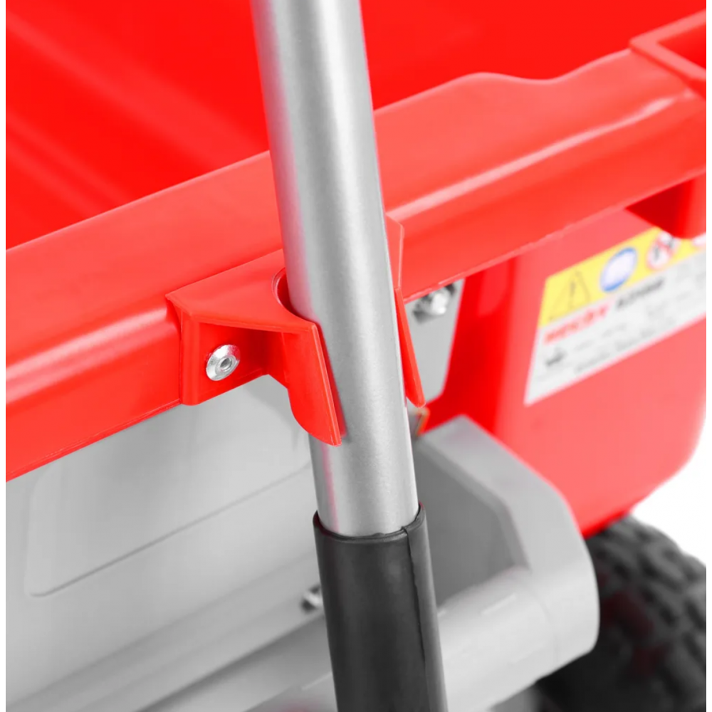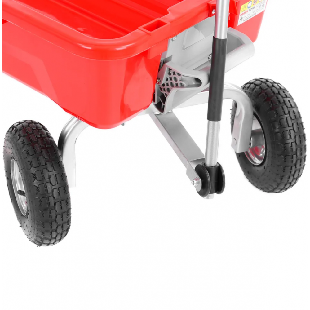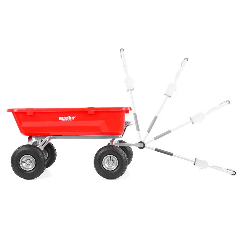 Рукоятка знімається, що звільняє сполучну частину, яка дозволяє підвісити візок до трактора, такому як газонний трактор. Таким чином, ви отримуєте супер практичний причіпний пристрій!