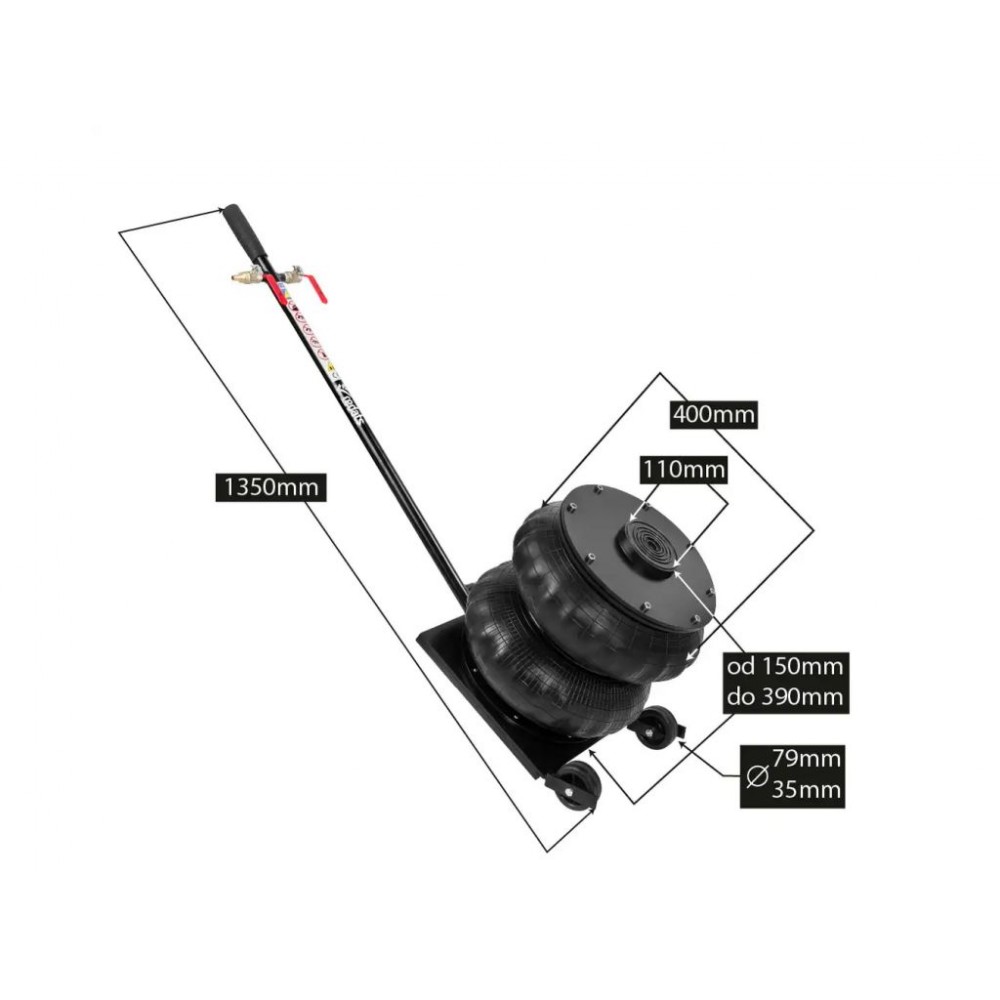 Домкрат працює при тиску 6-8 Бар, для захисту від перевищення тиску є запобіжний клапан. Вхідний і вихідний клапани забезпечують ідеальну герметичність навіть при від’єднанні шланга стисненого повітря. Завдяки міцним колесам і посиленій ручці цей пневматичний подушковий домкрат можна легко і швидко позиціонувати під авто.