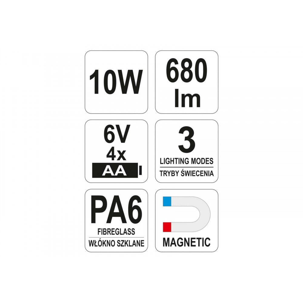 Легкий, портативний прожектор YATO YT-81821 для освітлення робочого місця або будівельного майданчика. Також корисний в домашній майстерні, в саду, на кемпингу. Перевагами продукту є потужне джерело світла 680 лм і стійкий до пошкоджень матеріал PA6 + GF30.