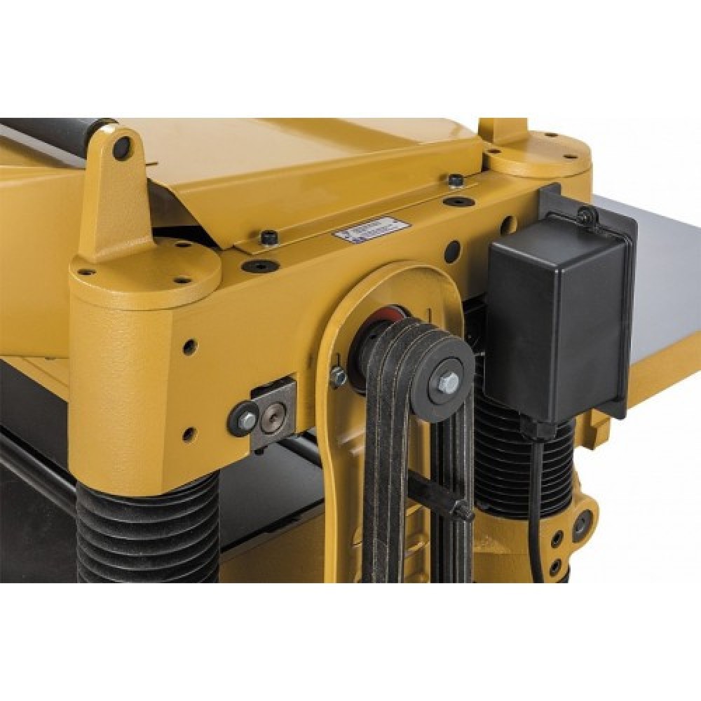 У верхній секції верстата розташовані металеві вали подачі (передній рифлений, задній гладкий), стругальний барабан і кігтьовий захист, двигун встановлений внизу, обертання на вал передається клиновими ременями.