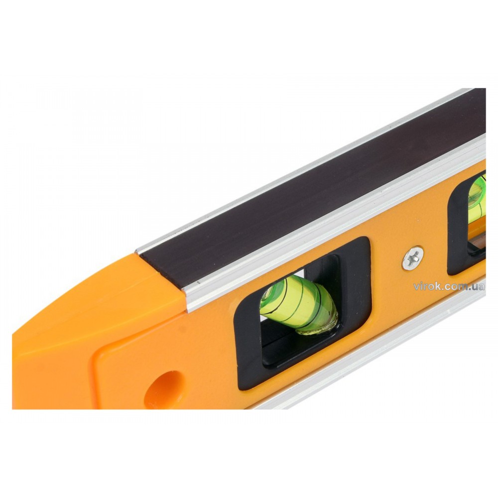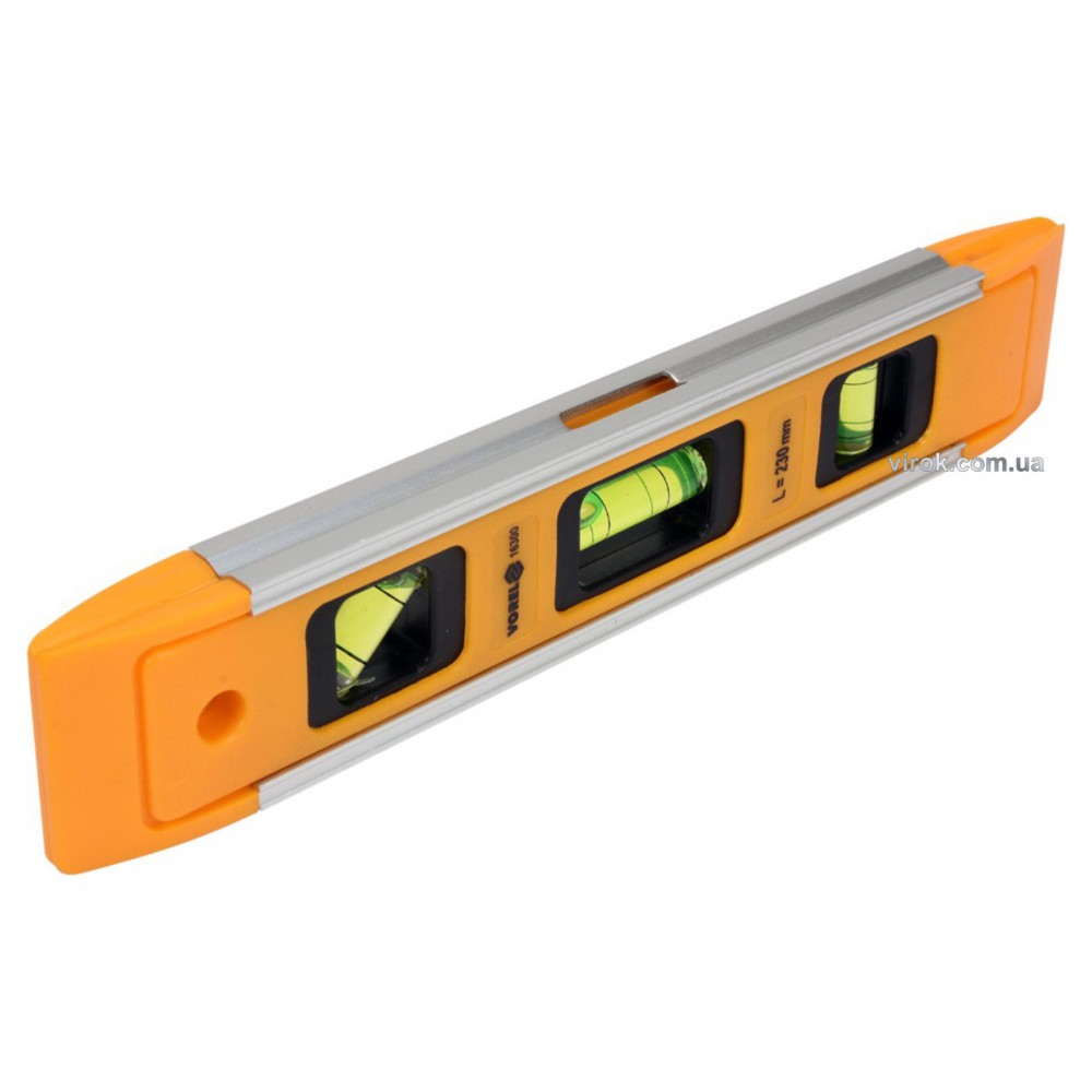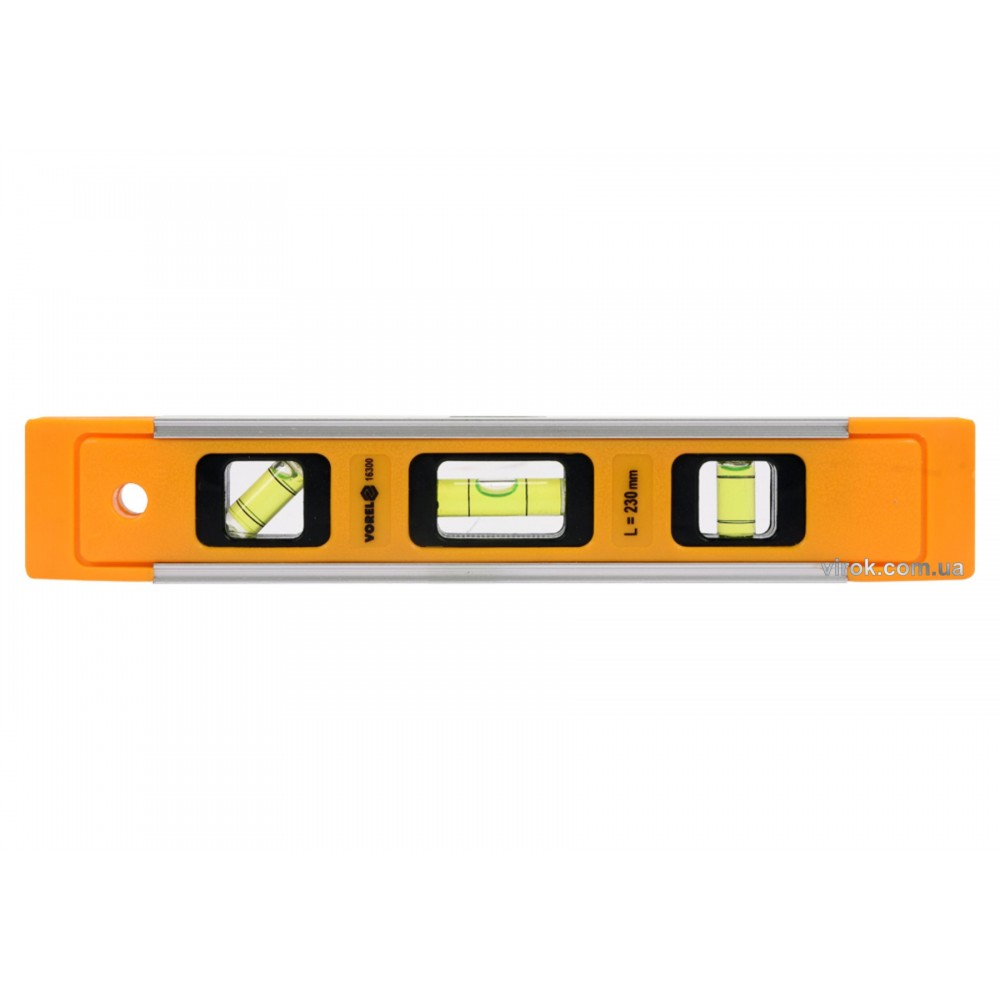Рівень VOREL 16300 торпедного типу призначений для простих вимірювальних задач. Корпус виконаний з ударостійкого ABS-пластику. Має три вимірювальні капсули – 0˚, 90˚ і 45˚. Магнитна основа полегшує вимірювання на металевих поверхнях. Краї рівня армовані з алюмінієвих профілей, це подовжує термін служби та підвищує точність вимірювань.