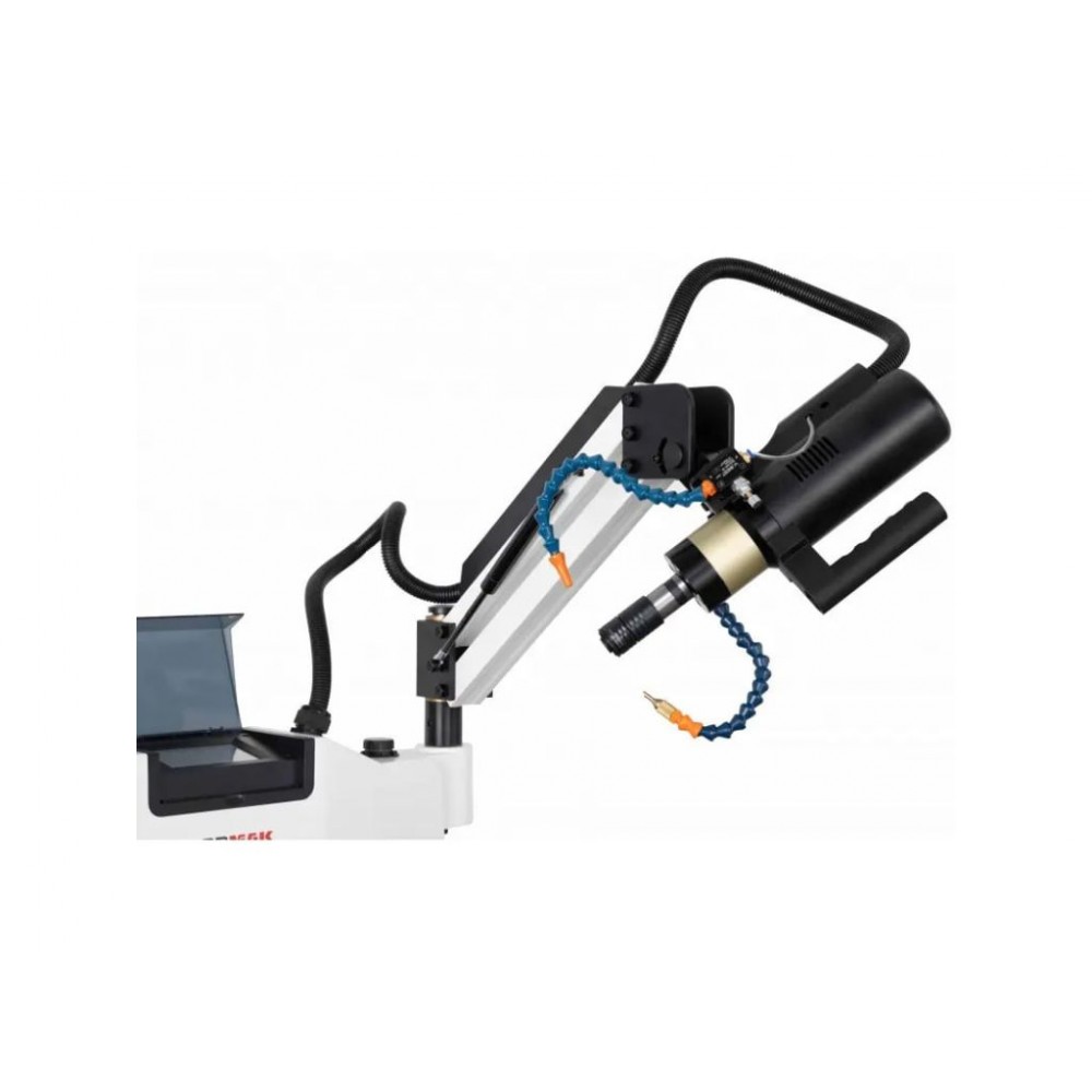 Верстат оснащений системою мікророзпилення мастила, яка забезпечує постійне охолодження з мінімальною витратою матеріалу, і продувною системою, яка видаляє стружку і підтримує максимальну видимість робочої зони. Швидкозатискний патрон дозволяє швидко і легко кріпити мітчики для наскрізних і глухих отворів. Цей настільний різьбонарізний верстат відмінно підходить для роботи зі сталлю, нержавіючою сталлю, алюмінієм і кольоровими металами.