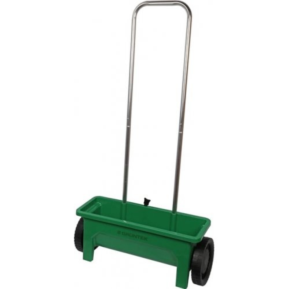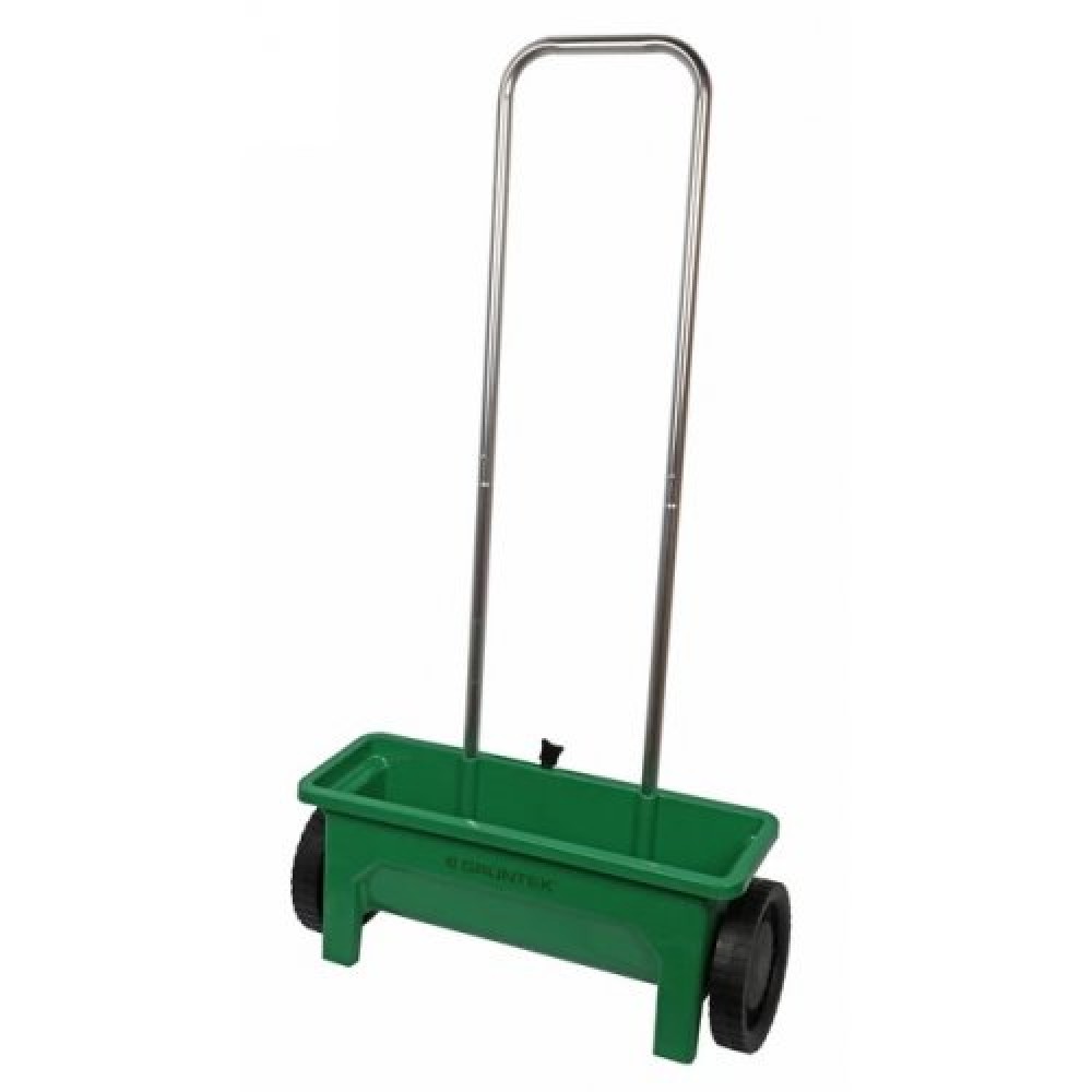 - Всі матеріали, з яких виготовлений розкидач Грюнтек, стійкі до корозії: рама виконана з міцної сталі з порошковим покриттям, контейнер і колеса - з міцного пластику, стійкого до УФ.