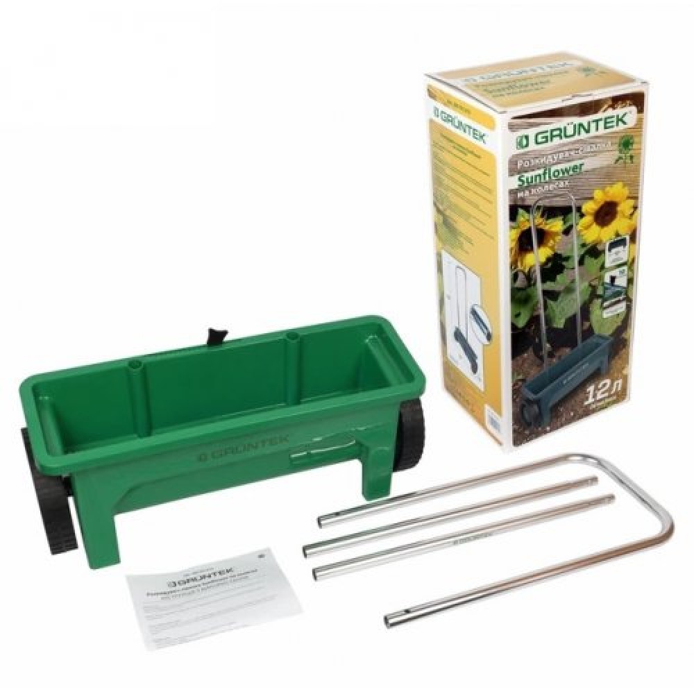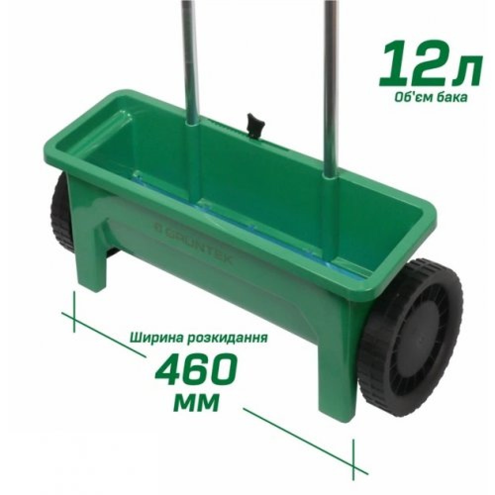 Розкидач-сівалка GRUNTEK Sunflower 12 л на колесах - універсальний інструмент для рівномірного внесення гранульованих добрив, насіння, солі, піску тощо. Підходить для використання на невеликих та середніх ділянках, площа яких не перевищує 400 м2.