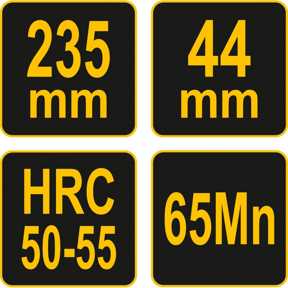 Рубанок для дерева, виготовлений з листового металу товщиною 1,8 мм. Довжина основи 235 мм, ширина 50 мм. Ніж виготовлений з марганцевої сталі 65Mn, 50-55 HRC, ширина ножа 44 мм. Тиск ножа за допомогою металевої ручки, регулювання ножа та глибини стругання - двома регулювальними гвинтами. Передня і задня ручки з пластику. Лакована поверхня.
