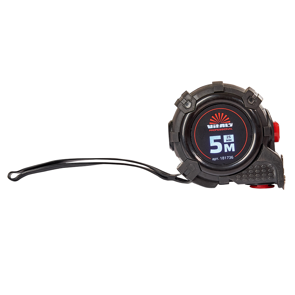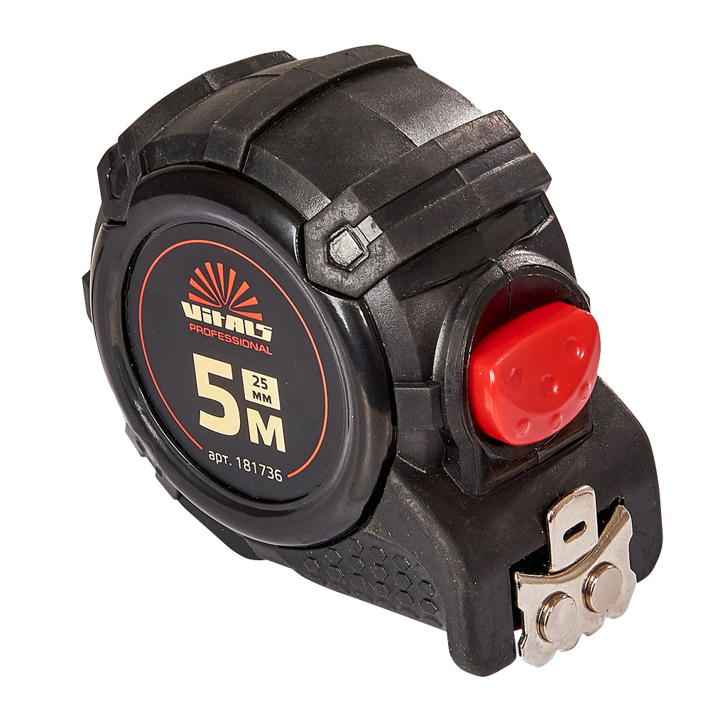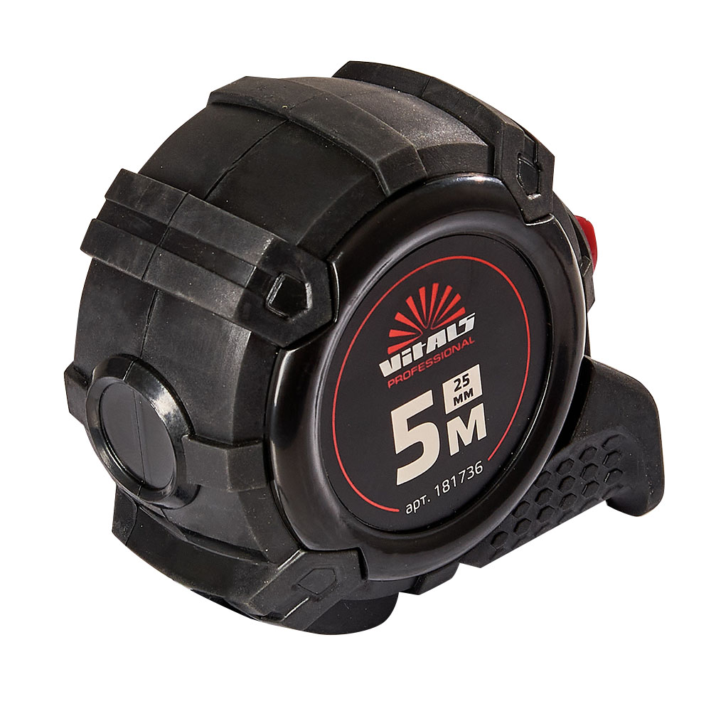 Вимірювальна рулетка гумова з нейлоновим покриттям полотна 5 м × 25 мм автостоп Vitals Professional призначена для вимірювання довжини під час проведення будівельних або ремонтних робіт.
