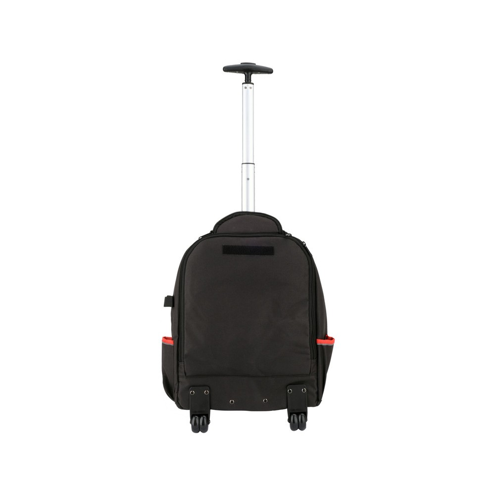 В основі використано два колеса та телескопічну висувну ручку у верхній частині, що дозволяє швидко трансформувати рюкзак у зручну транспортну валізу.