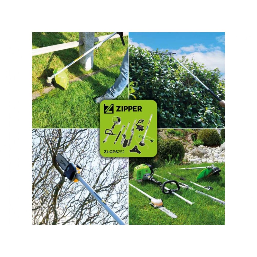 Садовий набір Zipper ZI-GPS252 - це універсальна комбісистема по догляду за садом, яка складається з 3 насадок (садові ножиці, пила і кущоріз) та приєднувальної штанги. Працює на основі 2-тактного бензинового двигуна об’ємом 51,7 куб.см і потужністю 1450 Вт. Повітряне охолодження двигуна і об’єм паливного бака 0,92 л дозволяють тривалу роботу без вимушених зупинок. Пристрій легко запускається за допомогою ручного стартера.