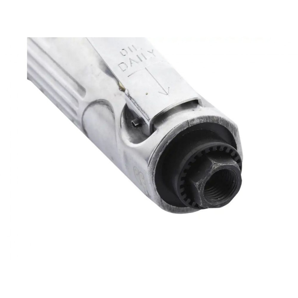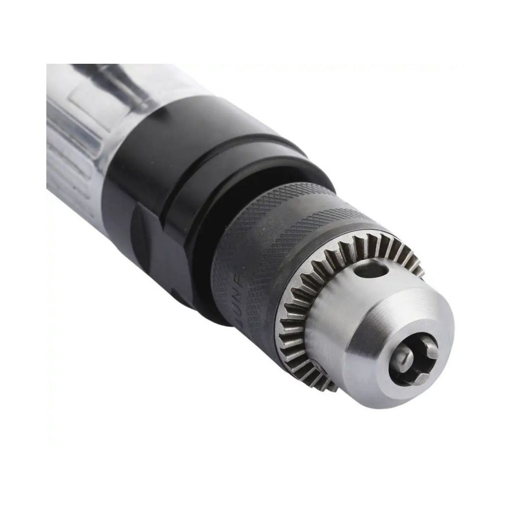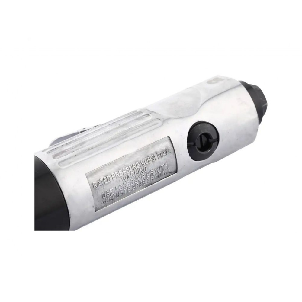 Швидкість обертання сягає 22 000 об/хв і плавно регулюється за допомогою курка, що дозволяє адаптувати інструмент під конкретне завдання. Блокування курка захищає від випадкового запуску інструмента. Повітря виходить через отвір на задній панелі, завдяки чому пил не осідає в робочій зоні. Завдяки довжині всього 210 мм і вазі 1,03 кг така пряма пневмодриль дозволяє добратися до найбільш важкодоступних місць і тривалий час працювати без втоми.