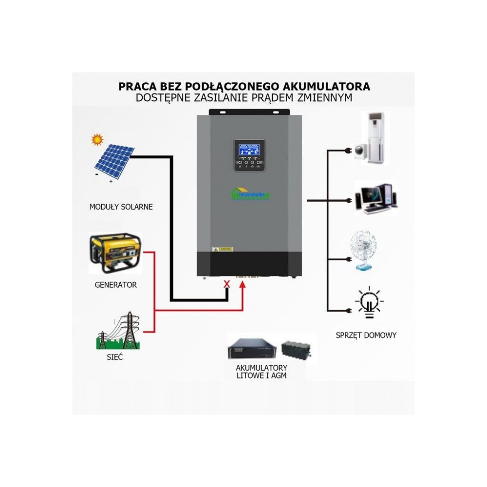 Цей інвертор забезпечує тривале безперебійне живлення електричних пристроїв, що потребують живлення 230В змінного струму, з можливістю вибору пріоритету живлення: мережа або сонячна батарея. Завдяки компактному дизайну його можна встановити навіть у невеликих приміщеннях або транспортних засобах.