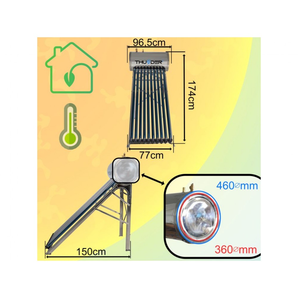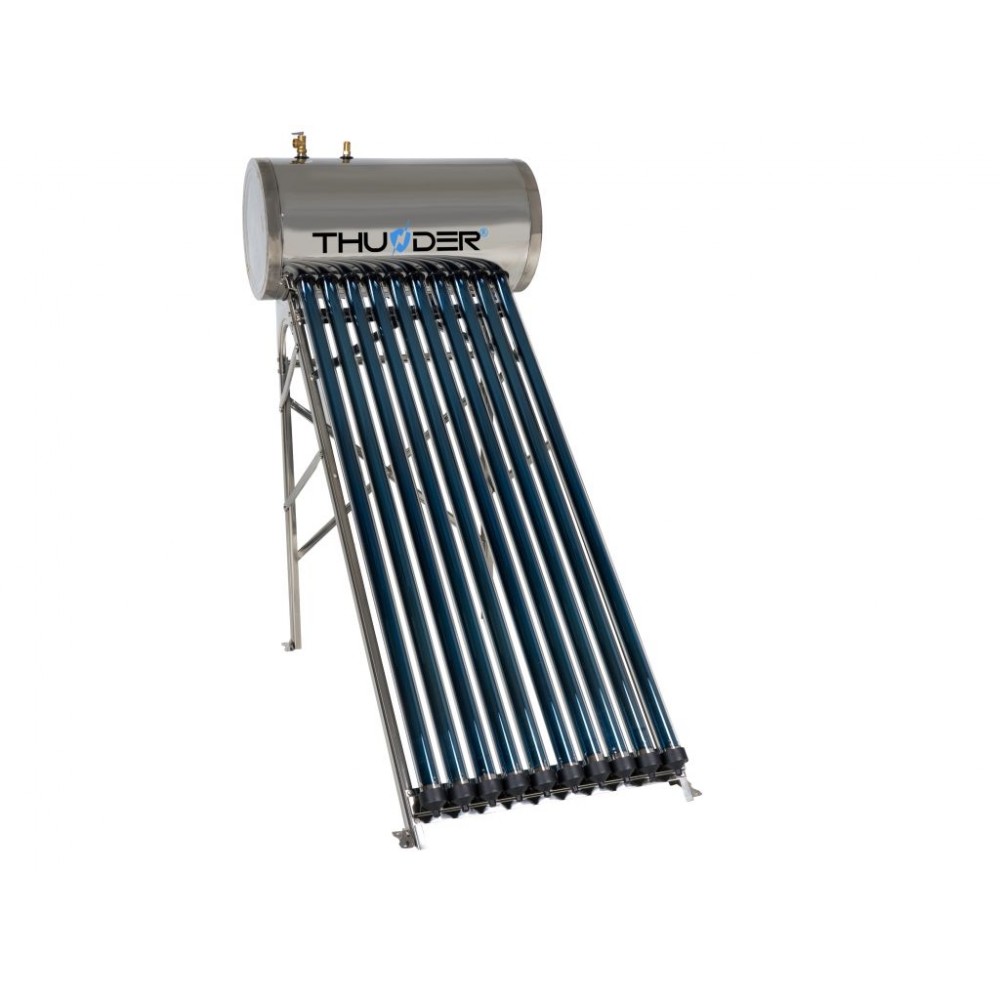 Сонячний колектор THUNDER KS-100L - використовує сонячну енергію для нагріву води, допомагаючи зменшити витрати на електроенергію та викиди шкідливих газів в атмосферу. Ця інвестиція пропонує багаторічні переваги. Він складається з вакуумних труб, розташованих на даху або на землі, які ефективно збирають сонячну енергію і передають її в резервуар для води. І навіть якщо одна трубка пошкодиться, система продовжить працювати. Відразу підігріта вода може бути використана для санітарних потреб або опалення.