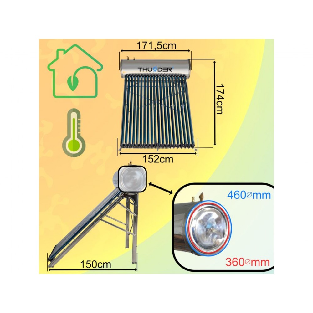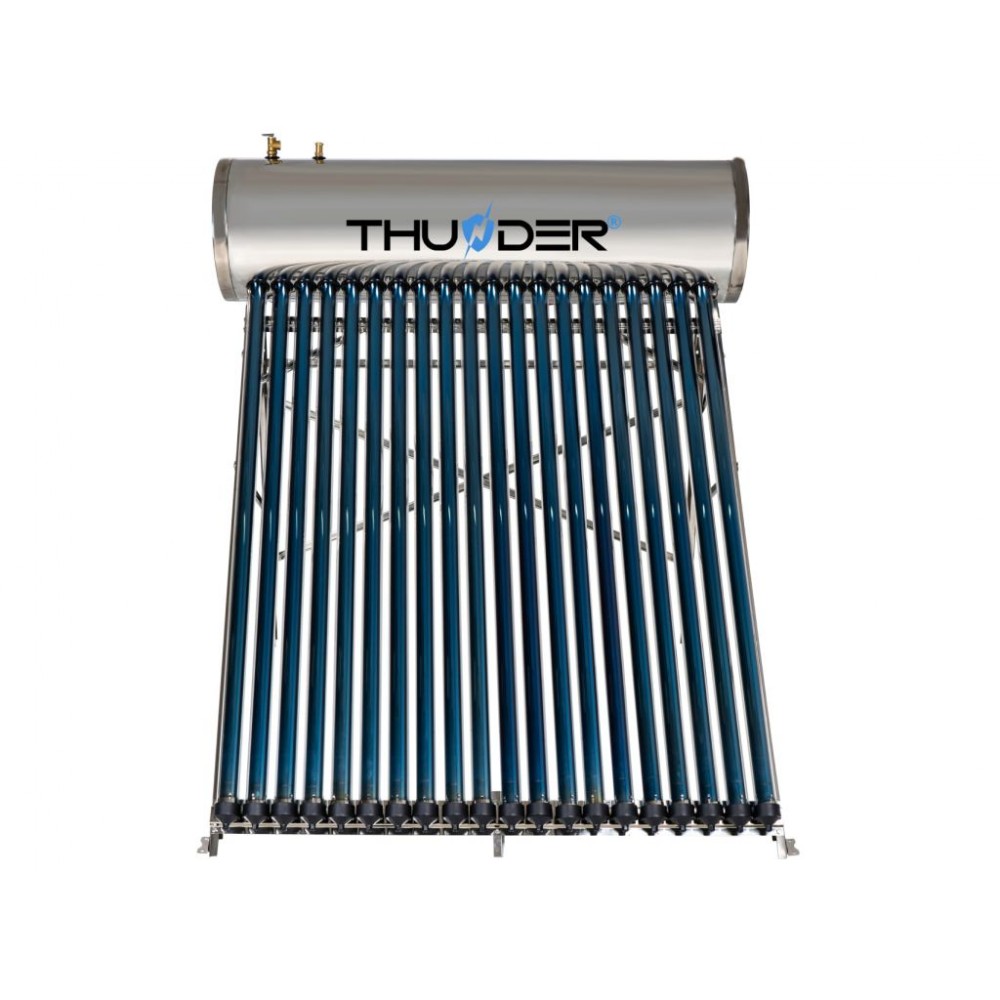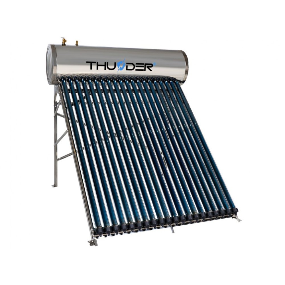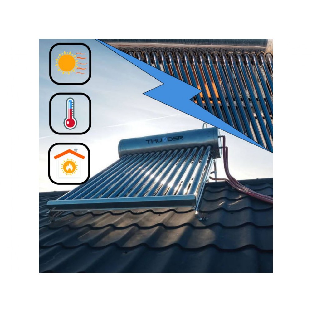 Сонячний колектор THUNDER KS-200L - використовує сонячну енергію для нагріву води, допомагаючи зменшити витрати на електроенергію та викиди шкідливих газів в атмосферу. Ця інвестиція пропонує багаторічні переваги. Він складається з вакуумних труб, розташованих на даху або на землі, які ефективно збирають сонячну енергію і передають її в резервуар для води. І навіть якщо одна трубка пошкодиться, система продовжить працювати. Відразу підігріта вода може бути використана для санітарних потреб або опалення.