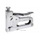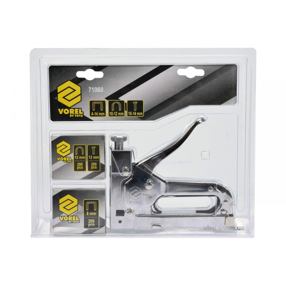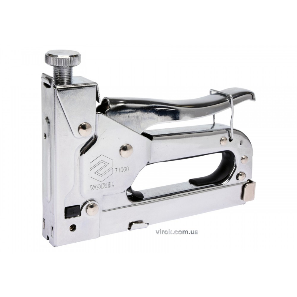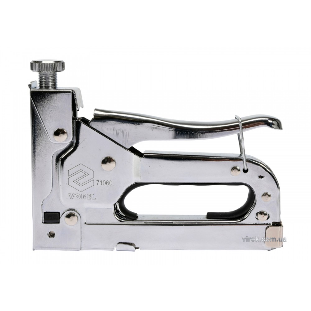 Степлер для оббивки Vorel 71060. Степлер для оббивки призначений для швидкого з’єднання різних матеріалів, наприклад дерева з тканиною, картоном, папером або шкірою. Використовується для оббивки, покрівлі, декорування, оздоблення будівель тощо. З’єднує матеріали сталевими скобами або цвяхами, вбитими з великою силою. Степлер призначений для забивання типових сталевих, прямокутних скоб довжиною 4-14 мм, а також круглих скоб розміром 10-12 мм, призначених для кріплення електричних проводів. Додатковою корисною функцією є можливість забивати спеціальні цвяхи довжиною від 10 до 14 мм. Степлер з регульованим тиском бойкової пружини - регульована сила удару.