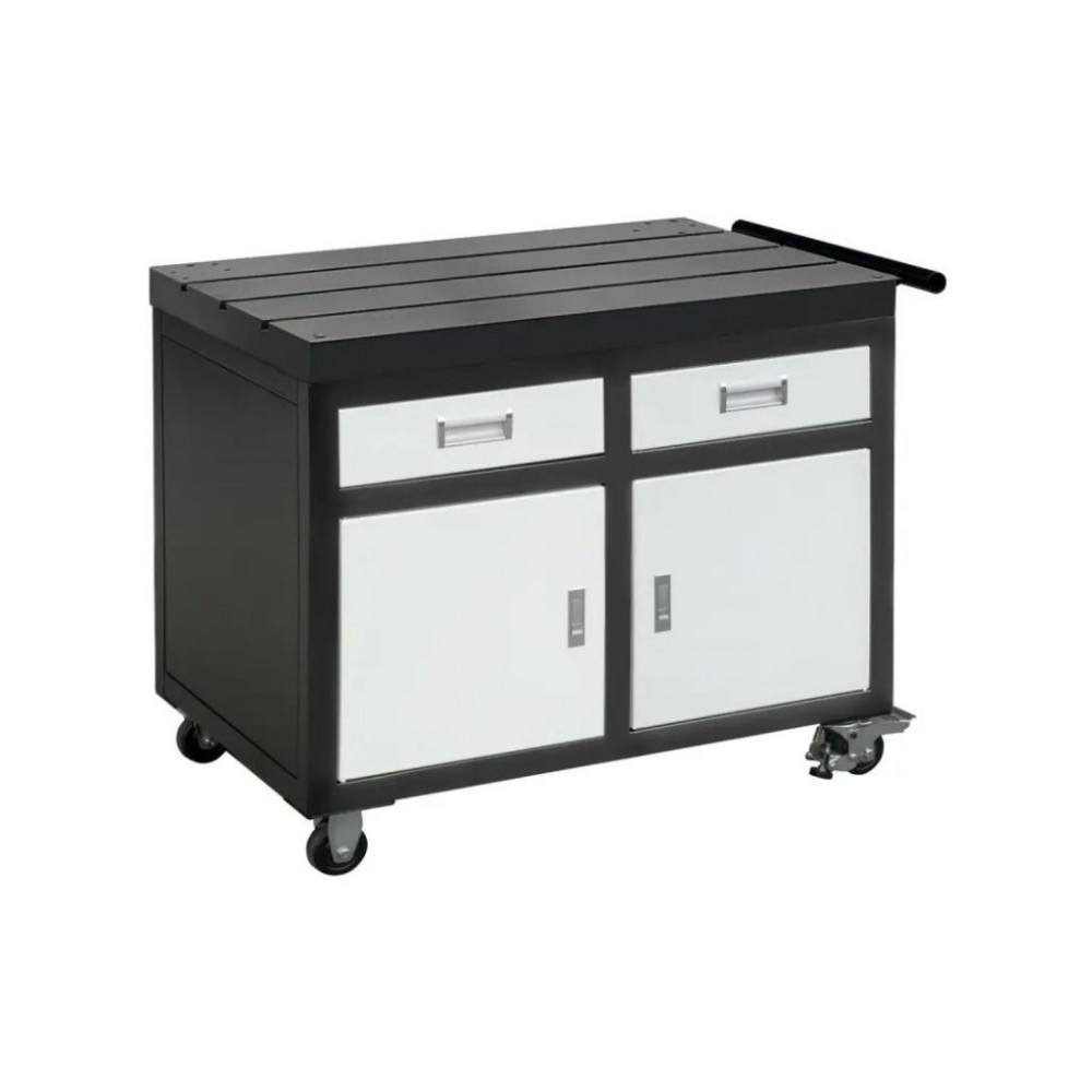 Для кріплення верстата є спеціальні монтажні отвори. Для фіксації заготовок та інструментів використовуються 3 Т-подібні пази шириною 14 мм з кроком 152 мм. Переміщуючи затискачі вздовж паза, можна адаптувати їх під розмір і форму конкретної заготовки, що дає змогу закріпити деталі будь-якої конфігурації. 2 вбудовані тумби і 2 ящики для зберігання приладдя, колеса та ручка для переміщення роблять цей стіл для різьбонарізних верстатів надзвичайно зручним і практичним.