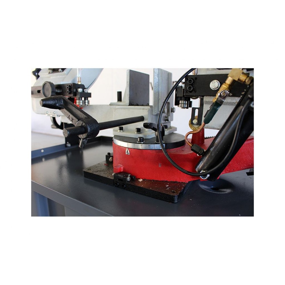 Здатність різати під кутами є незамінною функцією верстату, дана модель обладнана поворотною головою. На відміну верстату з поворотними тисками, на верстаті з поворотною ріжучою головою заготовку не потрібно повертати навколо верстату. Це дуже актуально для заготовок великої довжини. Також поворотна голова дозволяє досягти кращої точності кута різу. Поворотну голову гармонічно доповнює ексцентриковий зажим тисків, що дозволяє після регулювання тисків швидко зафіксувати або відпустити заготовку без повторного регулювання, що напряму збільшує ефективність роботи верстата.