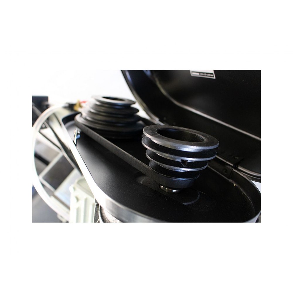 Даний верстат обладнаний ремінною передачею, регулювання швидкості відбувається за рахунок перекидання ременя на відповідний шків. Регулювання швидкості у стрічкових пилах по металу є важливою функцією, тому що вона має безпосередній вплив на якість та швидкість роботи з заготовкою. Регулювання швидкості дозволяє операторові адаптувати швидкість різання до конкретного матеріалу, що безпосередньо впливає на ефективність та якість обробки. Підбір відповідної швидкості допоможе уникнути перегріву полотна чи заготовки, що сприяє тривалішому терміну служби полотна та очікуваному результату від роботи, також регулювання допомагає уникнути зайвої вібрації.