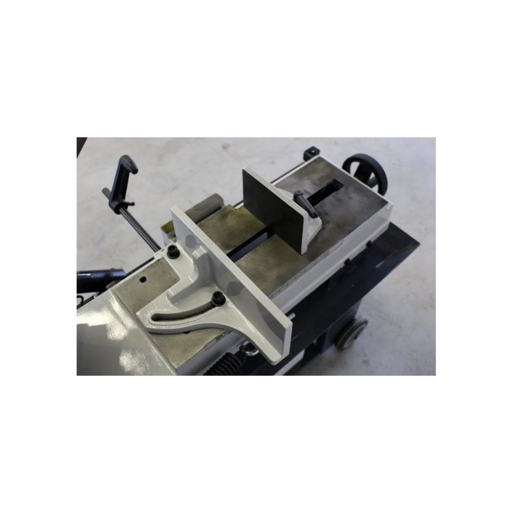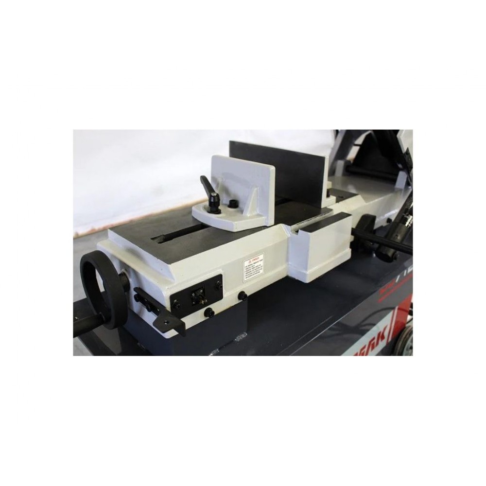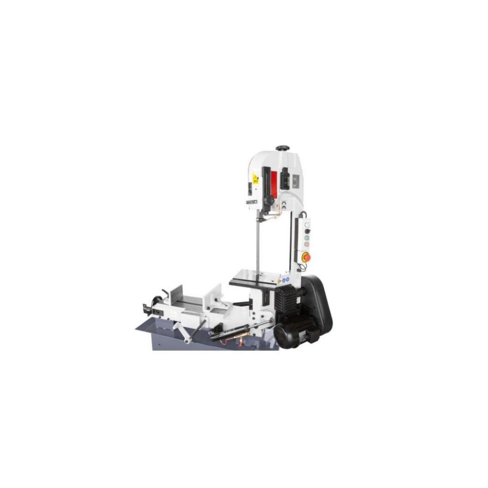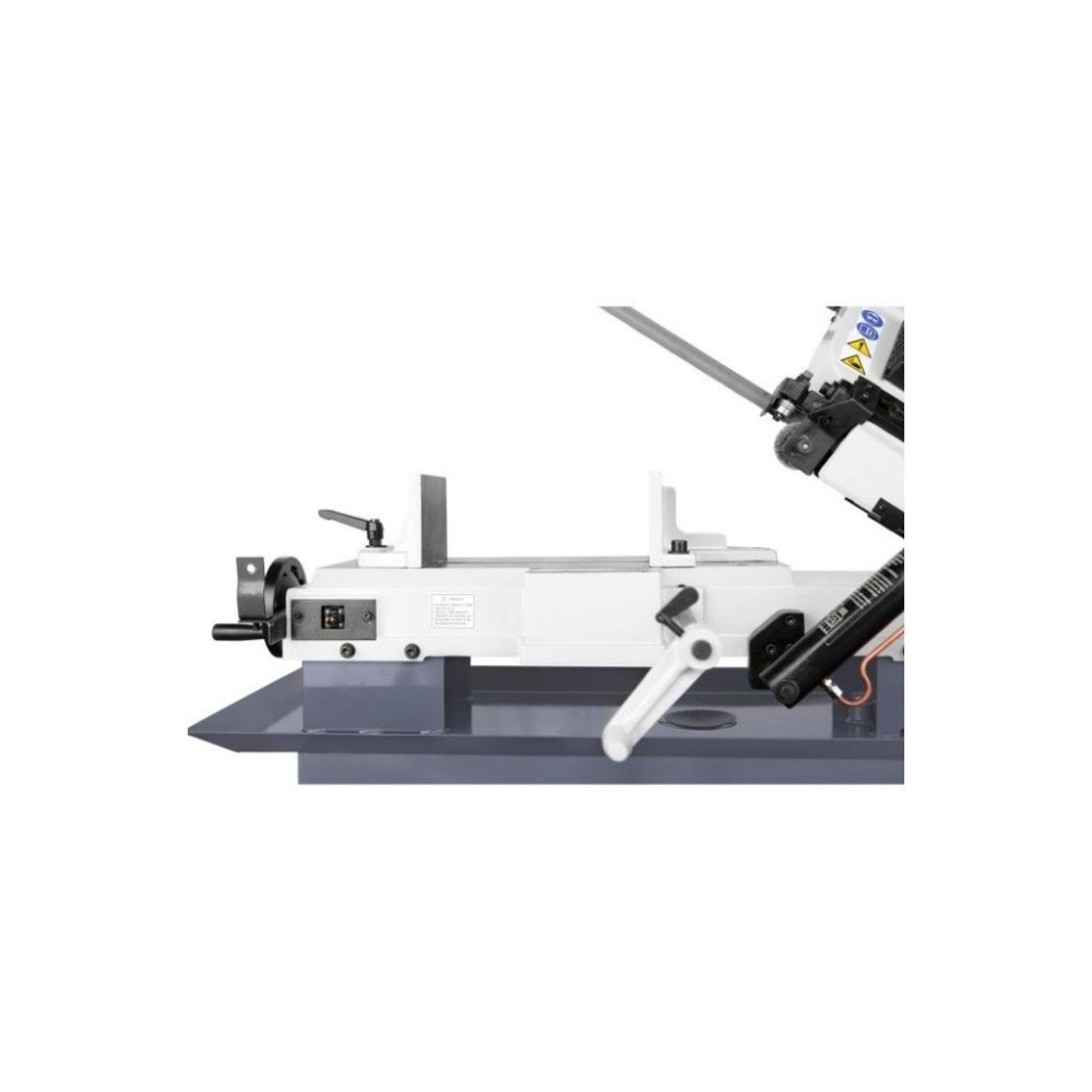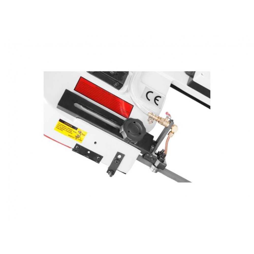 Пила обладнана поворотними лещатами, що дозволяє різати матеріал під кутом від 0 до 45 градусів, а міцна станина з чавунним робочим столом забезпечує стабільність роботи і гасить вібрації. Полотно висотою 20 мм виконує точний і чистий різ як металевого профілю, так і суцільних заготовок.