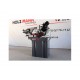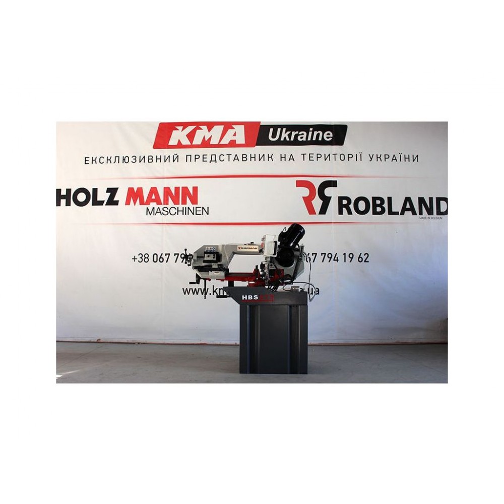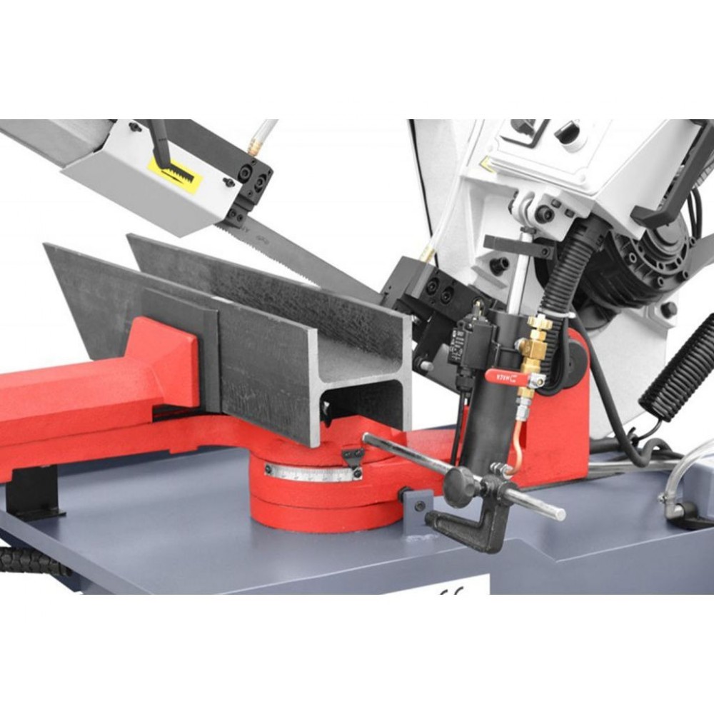Основа з литого чавуну та високоякісна стрічка шириною 27 мм. Плавне опускання ріжучої голови за допомогою гідроциліндра дозволяє контролювати процес роботи. Завдяки індукційному двошвидкісному двигуну потужністю 1,1/1,5 кВт із захистом від перегріву, верстат може тривало працювати без втрати ефективності. Оснащений захисними пристроями для безпеки оператора та манометром, який дозволяє слідкувати за натягом полотна.