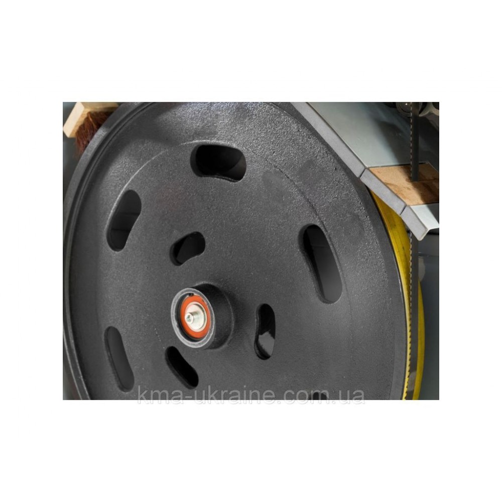 ![]() | Литі шківи з сірого чавуну, на відміну від алюмінієвих шківів, володіють великою масою та інерцією, тому не знижується їх швидкість і пила поводиться стабільно при різанні, особливо при вході в заготовку. Кожен шків проходить балансування. На нижньому шківі щітка для очищення від тирси. Шківи обгумовані. |