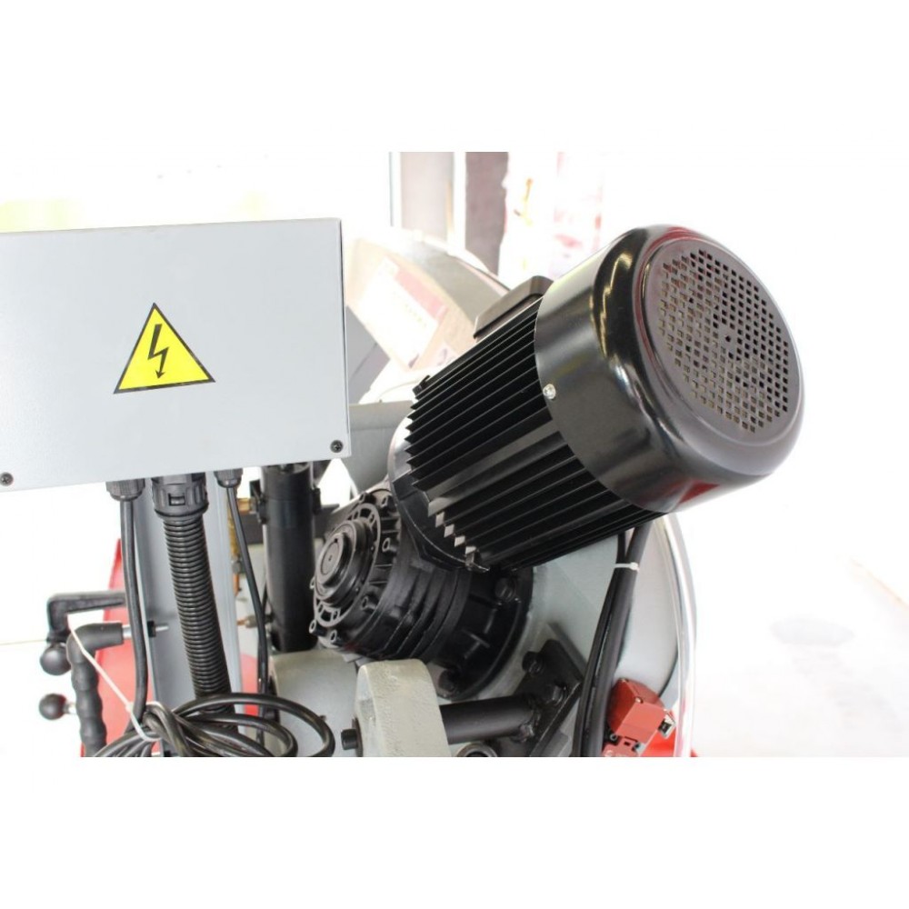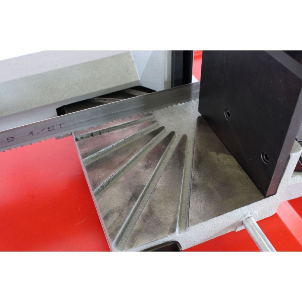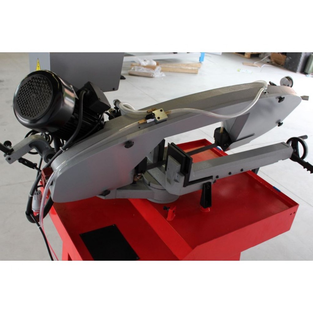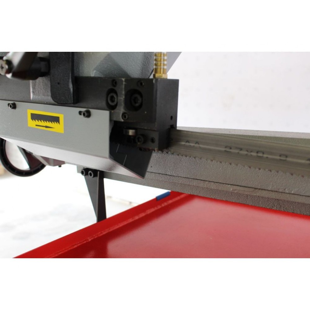 Опускання пильного вузла здійснюється автоматично або вручну. Швидкість опускання плавно регулюється гідравлічним циліндром. Для надійної фіксації заготовки використовуються швидкозатискні регульовані лещата. Система охолодження ЗОР запобігає перегріву і покращує якість різання. Станина доповнена відсіком для зберігання інструменту. Завдяки промисловому дизайну і якісним матеріалам виготовлення, ця стрічкова пила для різання металу надзвичайно ефективна і довговічна.