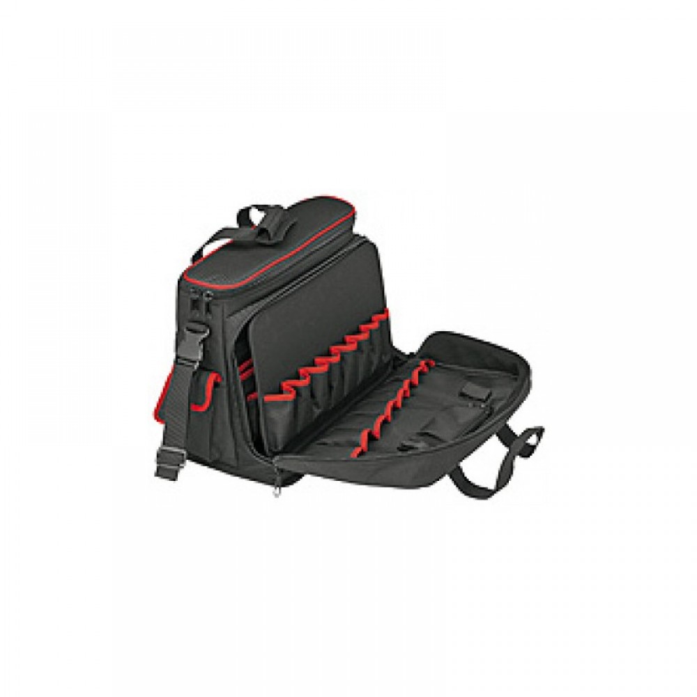 Сумка для інструментів та ноутбука, для сервісних робіт Knipex порожня, 00 21 10 LE м'яке внутрішнє відділення для ноутбука та документів формату А4, додатково є відділення на блискавці формату А4 передній карман з 8 відділеннями для інструментів і 1 карманом, що відкидається на 90° на внутрішній стороні переднього кармана є 5 відділень для інструментів і 3 відділення для олівців 1 знімна панель для інструментів з 8 відділеннями з лицевого боку та двома рядами еластичних петель на задній стороні. вологозахищена панель від підлоги регульований ремень через плече з експрес-застібкою з двома кріпильними петлями футляр з міцного поліестеру