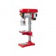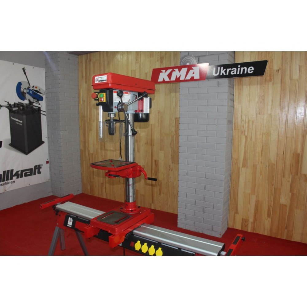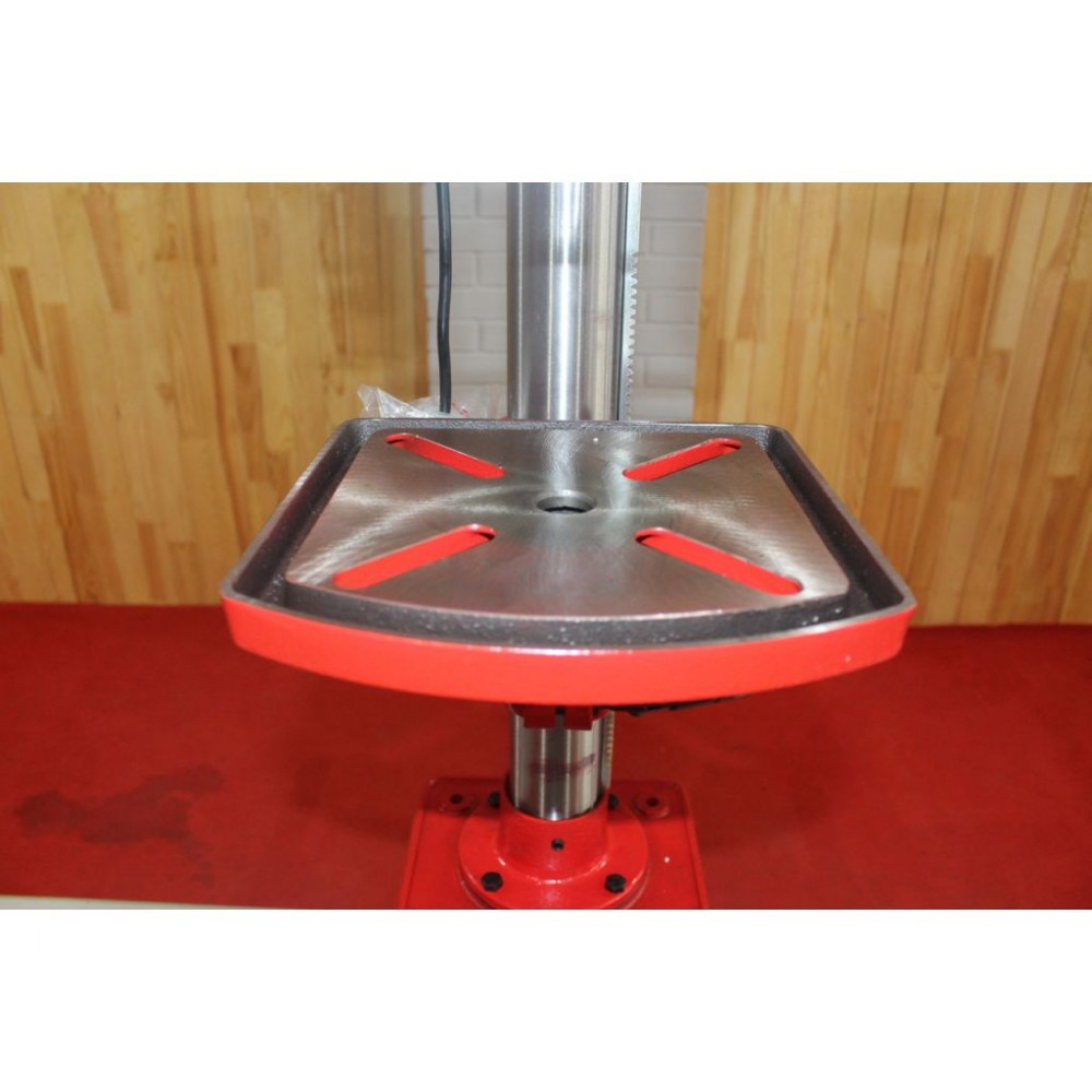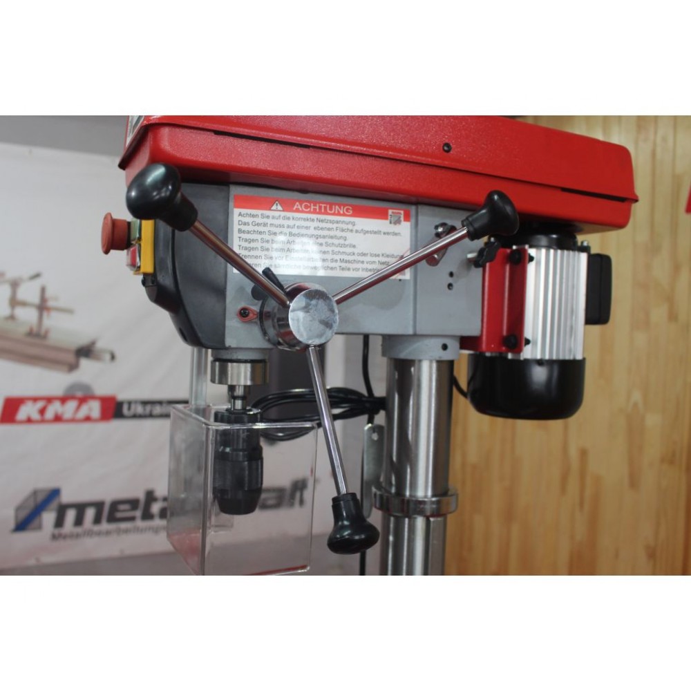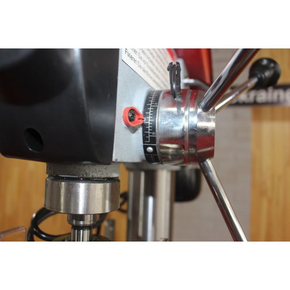 Швидкість обертання шпинделя регулюється на 12 кроків у діапазоні 180-2740 об/хв. Регулювання швидкості здійснюється перекиданням ременя. Стіл верстата виконаний з чавуну, має поворот на 360° навколо колони і регулюється по висоті за допомогою зубчастої рейки. Для обробки великих деталей стіл можна відвести в сторону і як опору використовувати основу. Контроль процесу обробки забезпечують триплечий важіль зі шкалою глибини свердління і обмежувач глибини свердління. Цей настільний верстат для свердління відповідає європейським стандартам якості та безпеки, що підтверджує сертифікат СЄ.