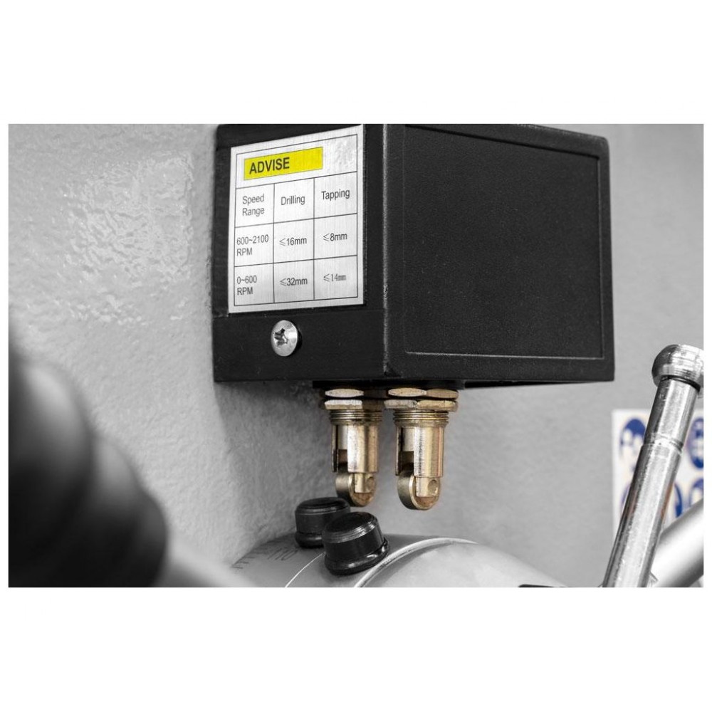 Регулювання швидкості є важливою функцією у свердлильному верстата, адже під кожен матеріал та діаметр свердління потрібно підбирати відповідну швидкість, чим твердіший матеріал тим меншу швидкість і чим м’якший тим більшу швидкість можна встановлювати. Саме дана модель обладнана плавним регулювання за допомогою частотного перетворювача та ремінною передачі, що дозволяє доволі точно підібрати відповідні оберти шпинделя. Правильно обрана швидкість запобігає передчасному затупленню свердла, його перегріву чи навіть повного руйнування. Не правильно підібрана швидкість теж має негативний вплив на матеріал, може відбутися перегрів який може призвести до послаблення матеріалу чи навіть до загорання чи плавлення. Регулювання швидкості дозволяє з максимальною ефективністю реалізувати потенціал потужності двигуна.