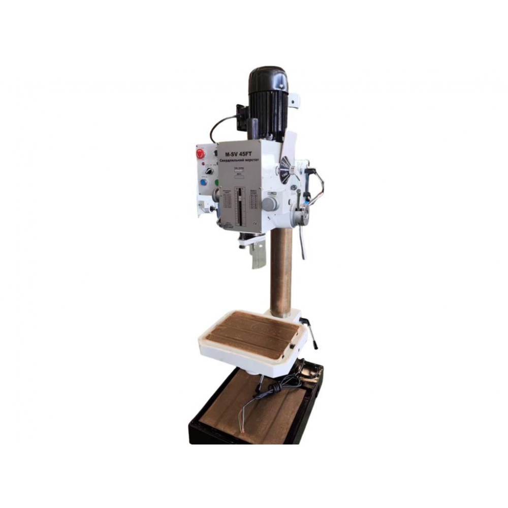 Свердлильний верстат MAST Metalltechnik M-SV45FT - це професійне обладнання для свердління, розсвердлювання, зенкування і розгортання отворів у сталі, чавуні та кольорових металах. Автоматична подача пінолі у діапазоні 0,06-0,3 мм/об, жорсткий шпиндельний вузол, конус шпинделя МК4 і витривалий двигун потужністю 1,5 кВт дозволяють свердлити глибокі отвори діаметром до 45 мм. Виліт шпинделя 290 мм, поворотна на 360° голова, регульована висота столу та можливість працювати без столу по основі дають змогу обробляти великі заготовки.