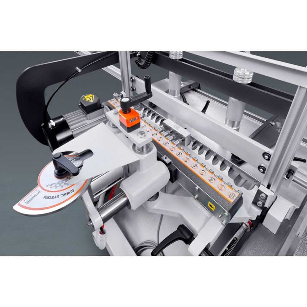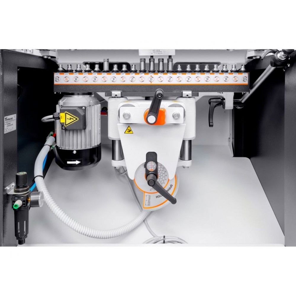 Оснащений 21 шпинделем. Свердлильний супорт має регульований кут нахилу від 0° до 90° та поперечне регулювання з цифровим індикатором. Плавне регулювання швидкості та глибини свердління забезпечує якісну обробку деталі і мінімізує ризик дефектів. Деталь позиціонується на робочому столі за допомогою позиційної лінійки і пневматичних затискачів, що забезпечує її надійну фіксацію під час обробки. Інтуїтивно зрозуміла і проста панель керування дає змогу зручно управляти процесом. Компактні розміри верстата дозволяють ефективно використовувати його на виробництвах з обмеженим робочим простором.