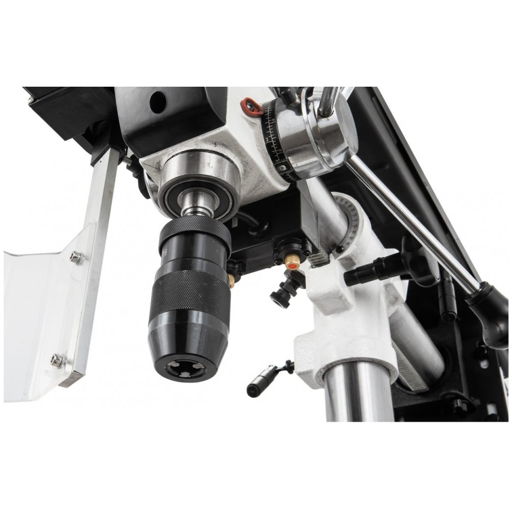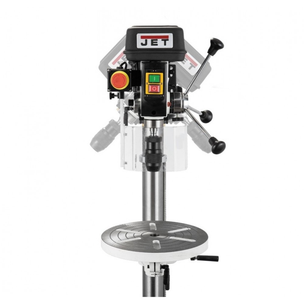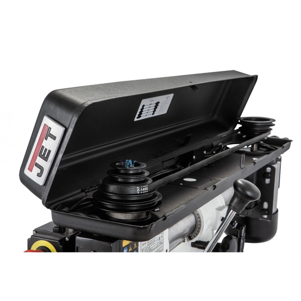 Ще однією особливістю радіально-свердлильного верстата JET JDR-34F є лазерний покажчик осі свердління. На ремінній кришці пристрою є кінцевий вимикач, а для швидкої зміни робочого свердла верстат обладнаний спеціальним швидкозатискним патроном. Слід також зауважити, що шпиндель здатний обертатися зі швидкістю від 500 до 2500 об/хв. Стіл цього верстата виготовлений із високоміцного чавуну.