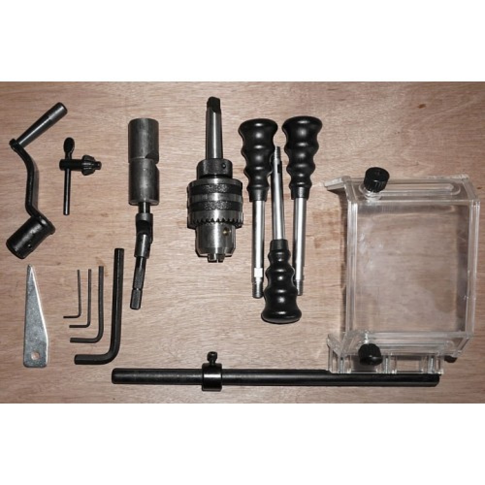 Надійна фіксація дозволяє зменшити вібрації. В основу вставляється товстостінна труба, на яку безпосередньо кріпиться голова свердлильного верстата. В керування верстат досить простий.