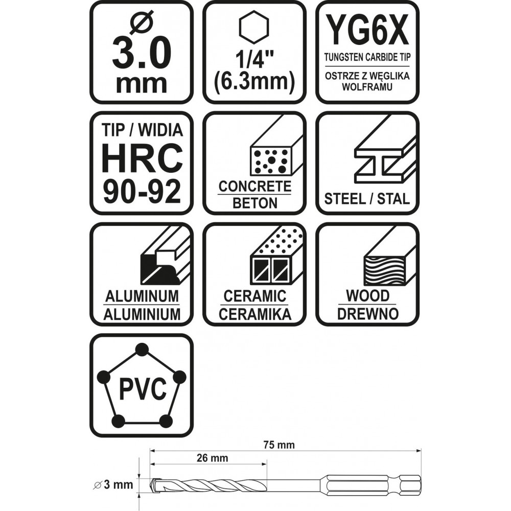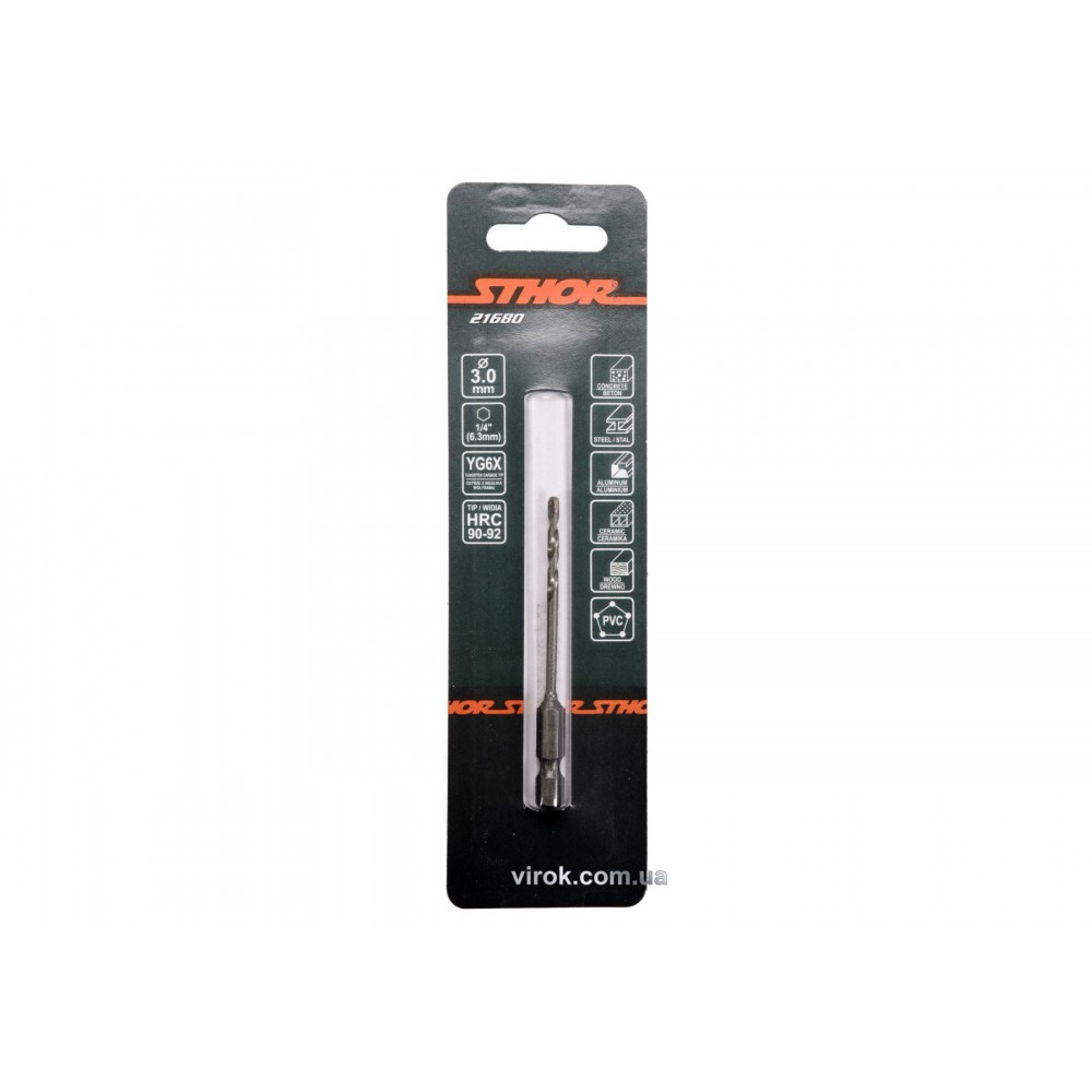 Свердло універсальне STHOR з шестигранним хвостовиком 1/4" 3 х 75/26 мм YG6X